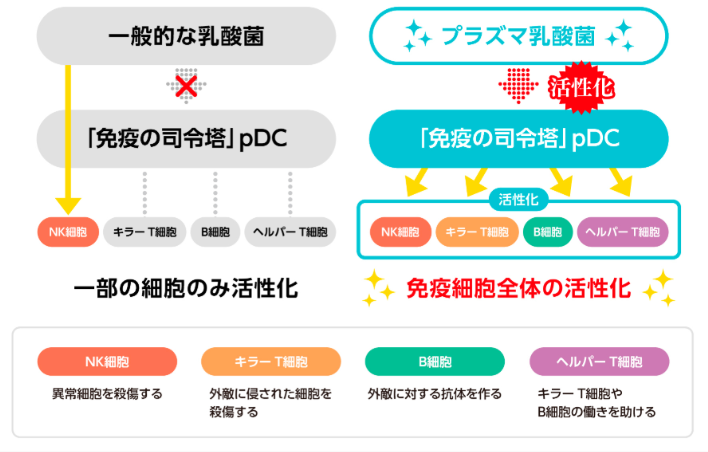 2010年,麒麟首次发现了对“免疫控制塔”pDC(浆细胞样树突状细胞)起作用的“血浆乳酸菌”。而在“血浆乳酸菌”被发现之前,全球范围内普遍认为乳酸菌无法激活pDC,最多能激活部分免疫细胞[4]。这意味着血浆乳酸菌的发现让免疫系统的激活变得更加高效。