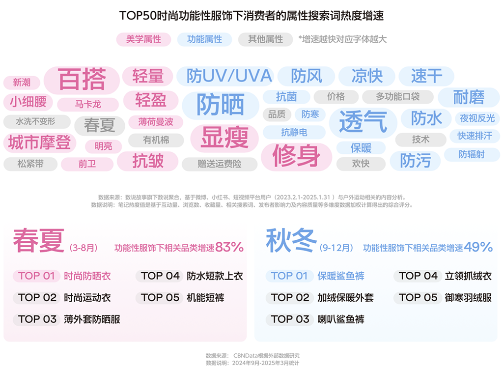 从热度增速和规模两大维度进行进一步拆解,CBNData发现当前的功能服饰市场中,“美学”属性占据较大市场份额,而“功能”属性增长势头强劲,消费者对具有时尚穿搭属性的功能性服饰需求日益递增。在此背景下,时尚防晒衣也成为2025年春夏最值得关注的功能性服饰赛道黑马品类。