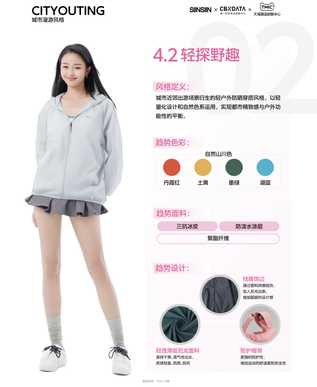 当探索城市的Citywalk和探索户外的露营活动逐渐成为生活方式,慢人Chillax、都市机能、摩登Dirtyfit、复古回潮等穿搭标签增速迅猛。在高温阳光充足的春夏季节,轻透薄层尼龙面料、加入反光边条的线痕饰边和包含防护帽领的全面防护尤为刚需,以自然山川为灵感的大地色系也成为趋势色彩。