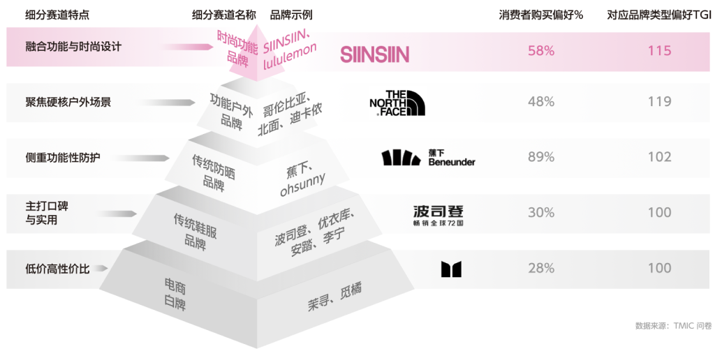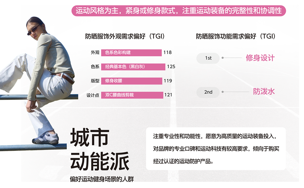 此外,《指南》还挖掘出愿意尝试裙装/阔腿裤等防晒成衣款,追求潮流趋势且乐于分享的「街潮创变者」;喜爱硬核户外,愿意为专业品质和品牌支付高溢价的「硬核远征者」;对产品成分和安全性要求极高,关注面料和成分口碑的「特需呵护党」。这六大人群共同构成了防晒服饰核心消费的多元画像,也意味着防晒服饰市场有着更加细分的品类增长方向。