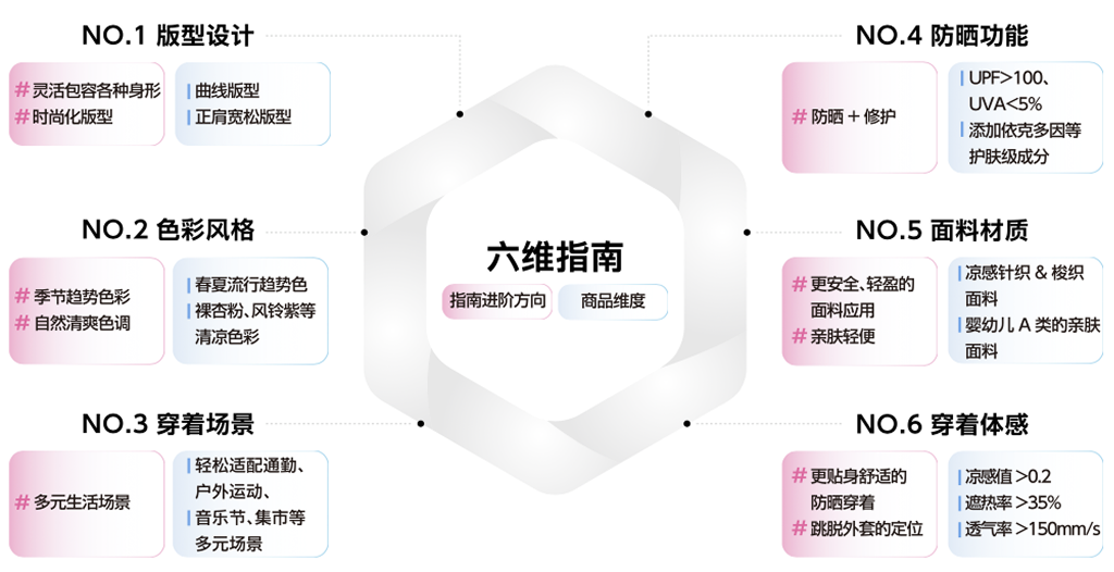 结合防晒服的热销趋势,CBNData联合SIINSIIN和天猫新品创新中心(TMIC)推出时尚防晒服饰六维指南,从版型设计、色彩风格、穿着场景、防晒功能、面料材质和穿着体感六个维度全方位拆解消费者选购防晒服的标准。