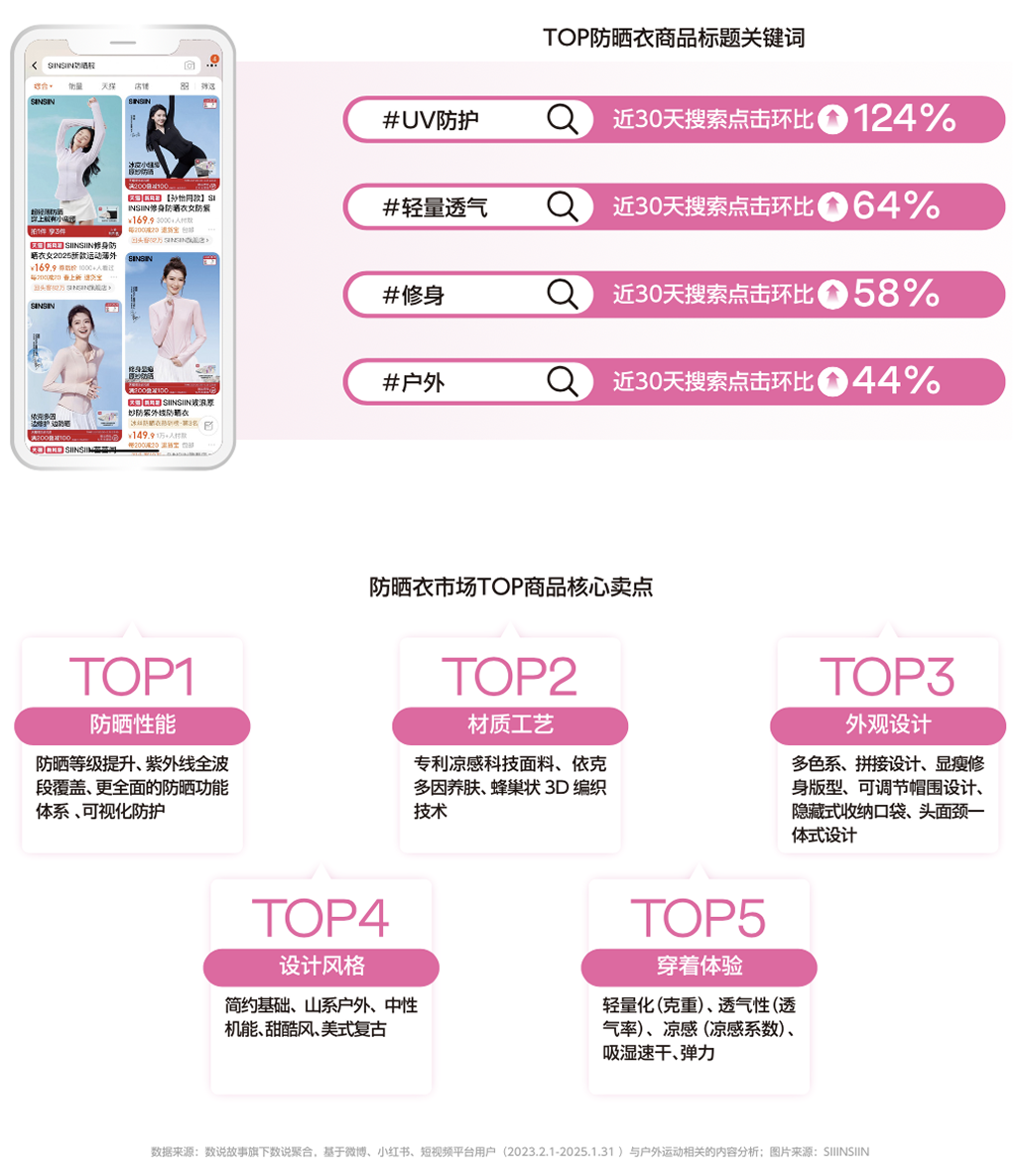 版型设计层面,从更加修饰身材的双C收腰设计到更灵活包容的正肩款式,消费者对防晒服的版型要求逐渐向时尚服饰靠拢;色彩风格方面,自然清爽的裸杏粉、风铃紫成为主推色系;穿着场景层面,防晒服正在融入多元生活场景,满足从通勤到社交娱乐等各类场合需求;在防晒功能层面,随着消费者对防晒认知更加深入,防晒指数UPF、UVA透射率等量化指标成为重要决策依据,而添加依克多因等护肤级成分的创新面料也满足了消费者边防晒边修护的进阶诉求;在面料层面,轻量、速干等户外运动服饰的核心功能也迁移至防晒衣品类;与此同时,从凉感值、遮热率到透气率,消费者对穿着体感的判断也有了更为客观的评价标准。