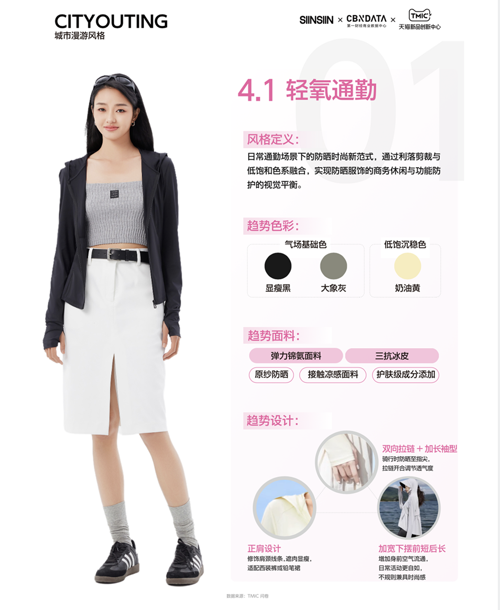 伴随着早晚通勤、办公室穿搭、商务聚会等多元工作场景的涌现,近年来smart casual、cleanfit、日系极简、通勤雅士等穿搭风格在社交媒体上声量火热,这些风格在防晒服品类有着同样的应用趋势。综合通勤风尚家的风格人群特征、适配春夏的风格元素以及商务休闲的风格场景,《指南》从色彩、面料、设计、场景、风格和单品给到全维度的趋势拆解。