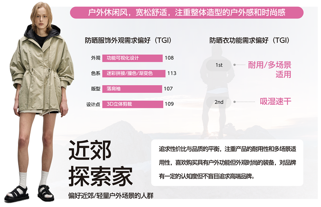 对于热衷于轻户外生活方式的年轻人而言,以功能可视化设计为特征的户外风格更受欢迎,接近自然的迷彩、适配户外场景的撞色和渐变色都成为趋势色系,而防风防水等户外进阶功能以及吸湿速干的面料也成为防晒服的重点开发方向。值得注意的是,理性依然是这类消费者的重要标签,对于他们来说,性价比和品质同样重要。