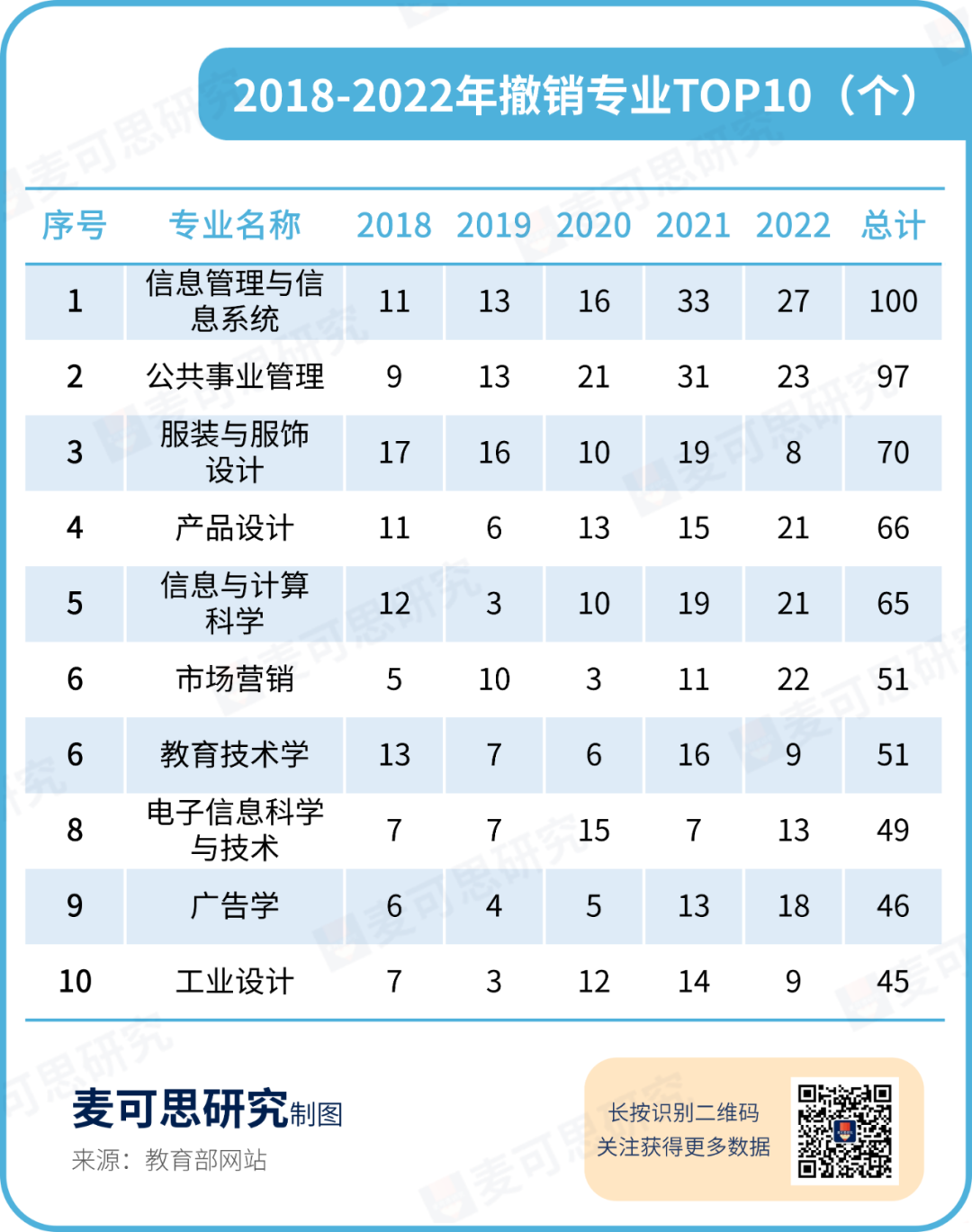 根据2018-2022年度教育部公布的撤销专业数据,近些年撤销的专业非常多,广告学排在前10。