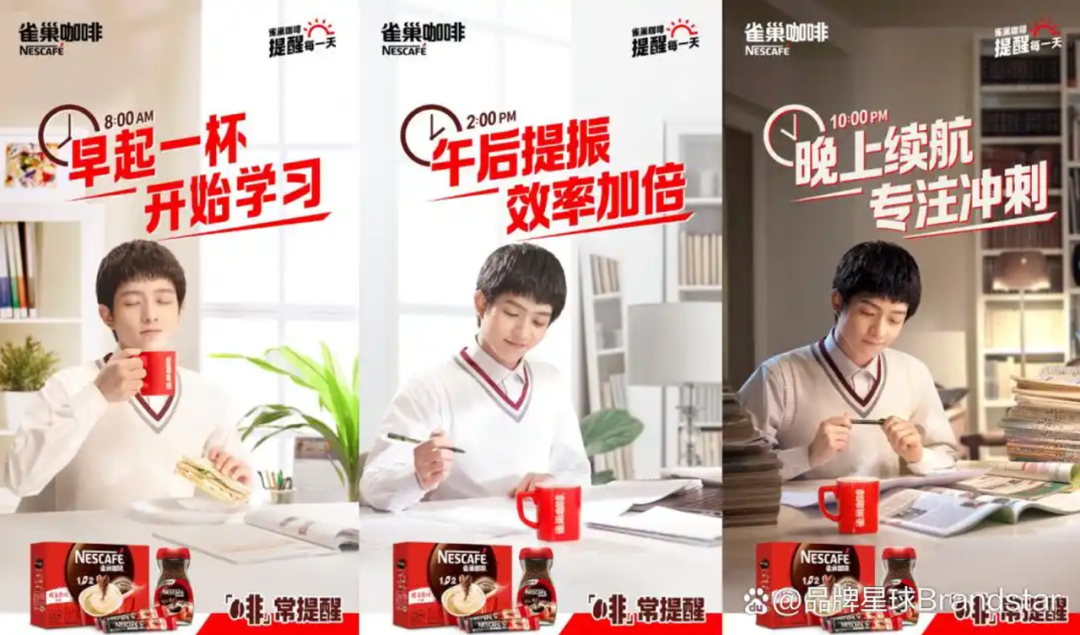 从每年2月高考百日誓师开始,持续数月在校园、社区、学区等场所传递品牌信息,拉近与学生群体的关系。雀巢咖啡告诉考生们,早上8:00“早起一杯,开始学习”、下午2:00“午后提振,效率加倍”、晚上10:00“晚上续航,专注冲刺”,可以说是全方位全时段陪伴考生们沉浸式学习[7]。