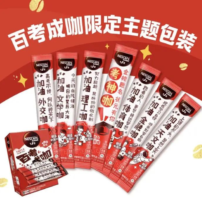 同时,雀巢咖啡还推出了“百考成咖”主题产品包装,通过多款创意文案为文学咖、理工咖、金融咖、外交咖、体育咖们加油打气。包装中还特别设计了一款隐藏“考神咖”为考生们送好运,祝愿他们历经百考,皆可成咖”“金榜题名,状元有你”[8]。