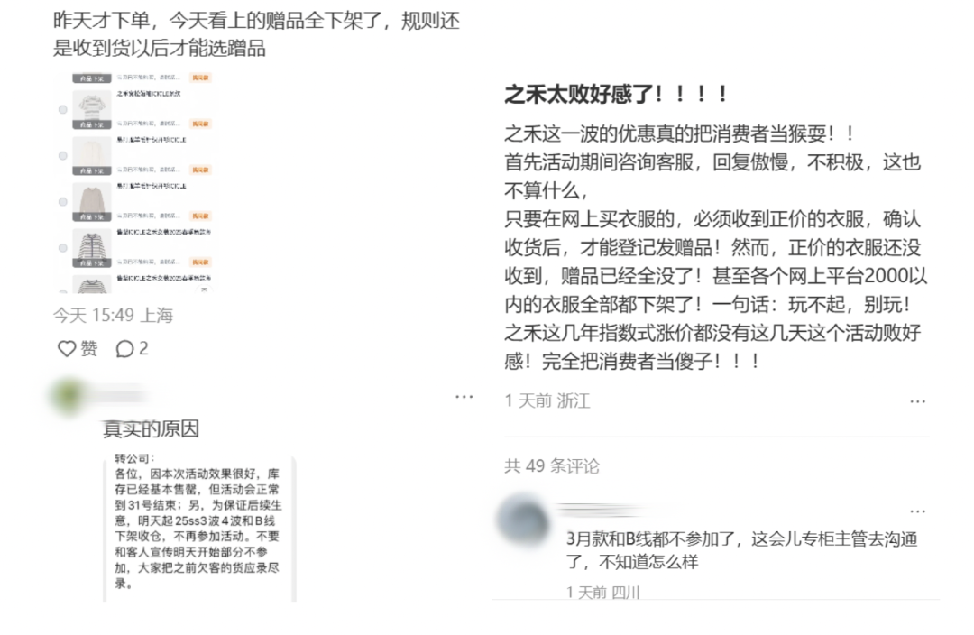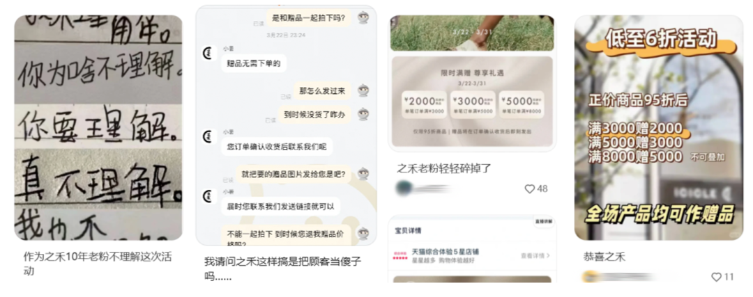 大额满赠活动一出来,之禾忠实顾客圈子里便“塌房”之声四起。主要原因在于,这砸锅卖铁的促销力度,和之禾高岭之花的品牌定位,落差太大。