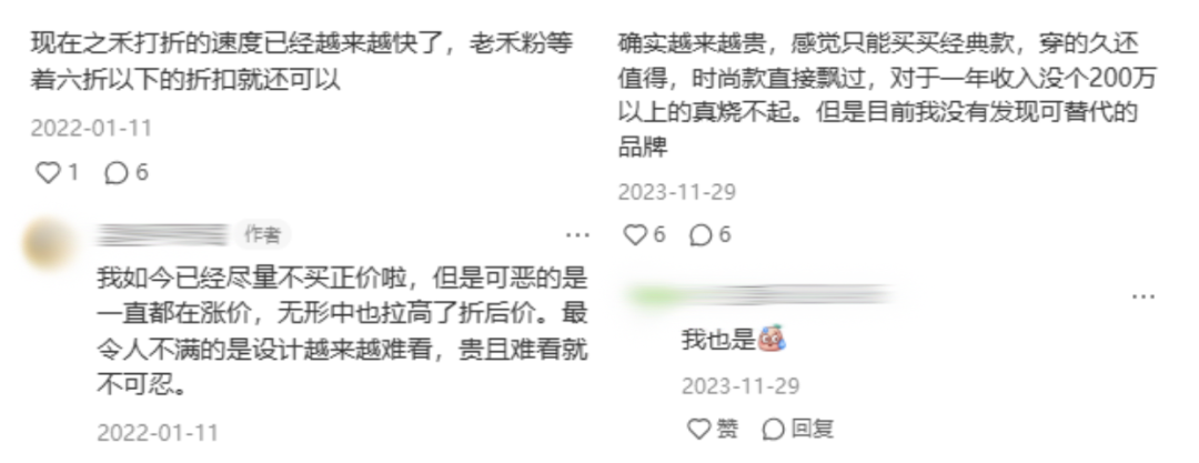 社交平台上一位经常分享之禾穿搭的博主@林间的小溪 在小红书笔记里写道,近期购买新款的“禾粉”,是“基于对之禾的绝对信任、对之禾折扣基本稳定的信任才花高价买的”,“当季打折多年以来就是一个禁区……两年后才进折扣店,就是为了不让顾客有稍微等等就能5折的想法,踏踏实实买新款”。