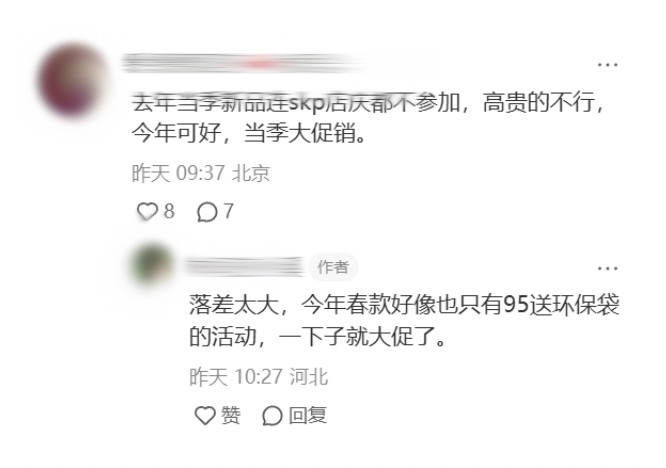 如今买3双袜子都可享“价保”(购买商品后一定期限内同商品若有降价可退差价),结果到这儿怀着一腔热情刚砸重金买新款支持品牌,转头就当季大促销,很难不心累:这些年的真金白银与时光,终究是错付了。