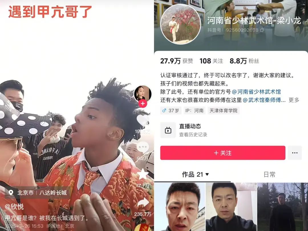 到了短视频平台,直播内容以切片与二创的方式通过短视频平台传播,甚至他在长城偶遇的阿姨@欣悦 邀请他拍摄的抖音内容都收获了超过190万的点赞,被广大网友戏称“中国行最搞笑的一集”。而教他功夫的少林师傅也在抖音开启了自己的直播,账号已经收获了近28万点赞。