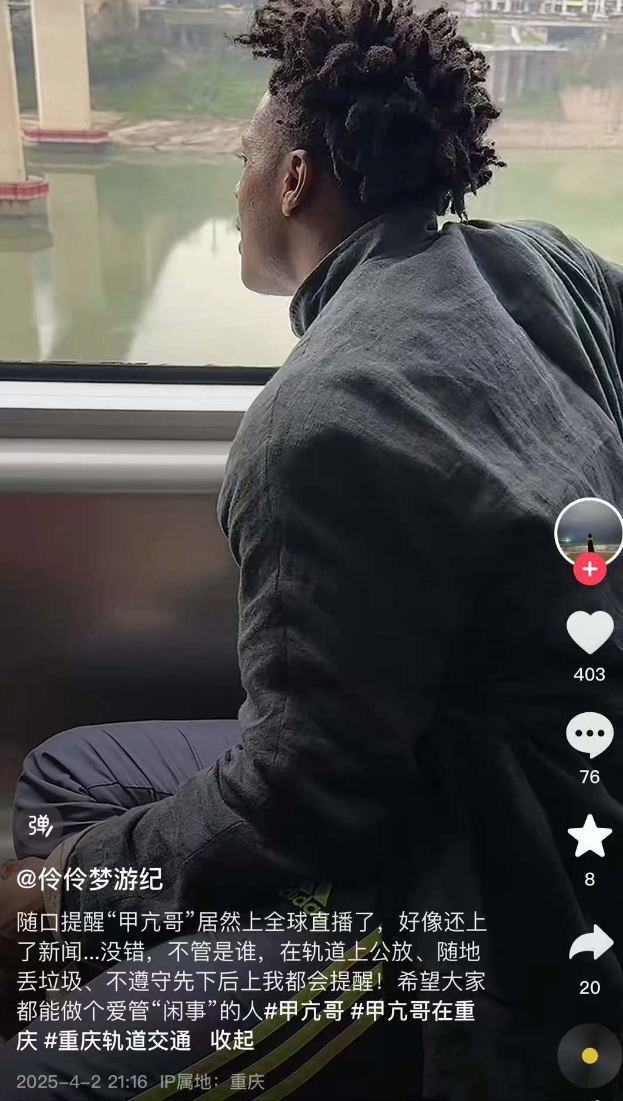 随后,“甲亢哥”点头表示赞同,称感谢提醒,并用中文回复“谢谢”。当晚这位女生在自己账号发了视频,说提醒不文明行为是每个人的责任,希望多传递正能量,也获得了全球网友的好评。