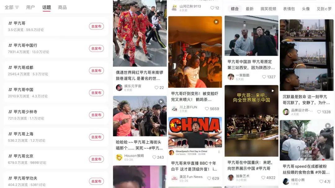 Speed中国行虽然在外网直播,但实时的图文路透在小红书引发讨论,#甲亢哥中国行 话题浏览量已超过7930万,#甲亢哥 个人话题讨论量超过59万。许多小红书用户晒出了偶遇、合影的片段表示欢迎,也有不少用户自发分析Speed中国行爆火的原因。