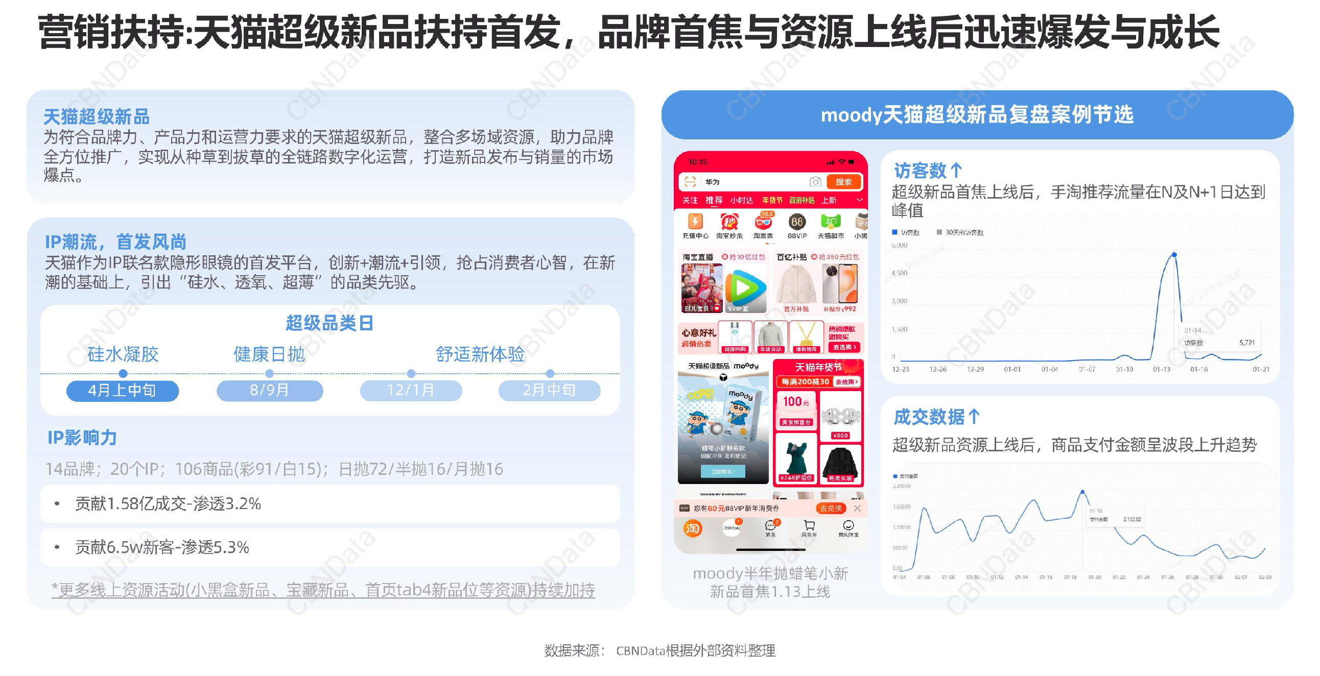 在营销侧,《报告》也提出,“健康日抛X硅水凝胶科技X新鲜的时尚设计X全天候适配”是品牌所能锚定的营销趋势,围绕着产品、价格渠道与促销品牌能够打开更多推广玩法。在更前沿方向上,通过光学智能品牌能够拓展娱乐、医疗以及科技领域的新裸眼体验。另外,通过渠道侧联合发力引爆流量也能够为品牌带来全链路的收益。天猫超级新品通过整合多场域资源,为品牌带来全链路数字化运营。moody在超级新品首页焦点上线后手机淘宝推荐流量达到峰值,商品支付金额也呈现上升趋势。