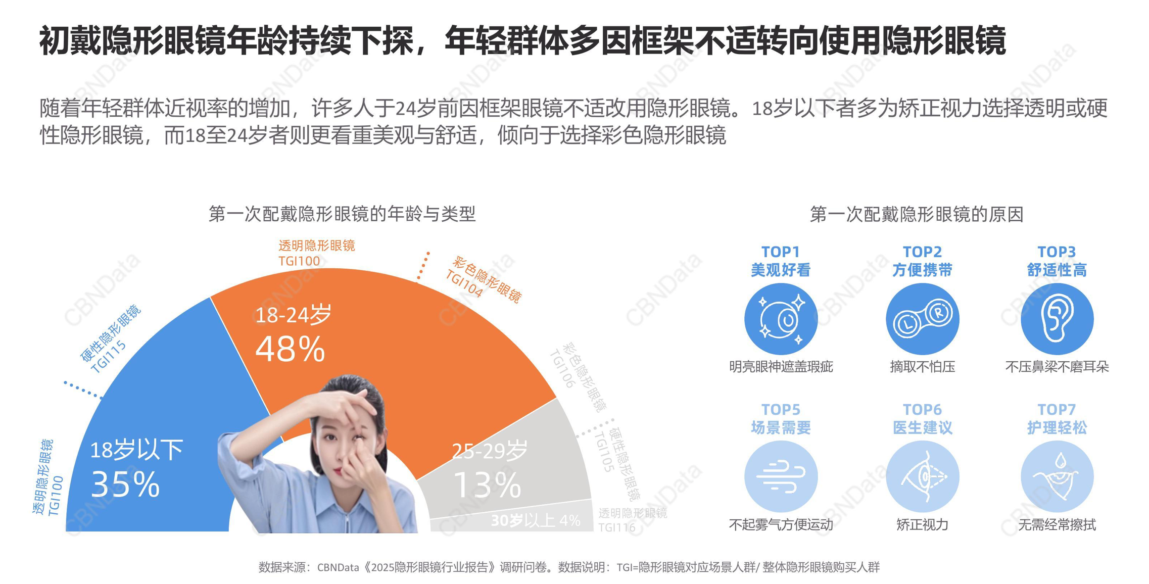 值得一提的是,初次配戴隐形眼镜的人群年龄持续下探,数据显示,超八成人群在24岁之前已尝试配戴隐形眼镜。18岁以下人群以矫正视力为主要目的,18至24岁的人群则出于美观、方便与舒适的需求,初次选择配戴彩色隐形眼镜。