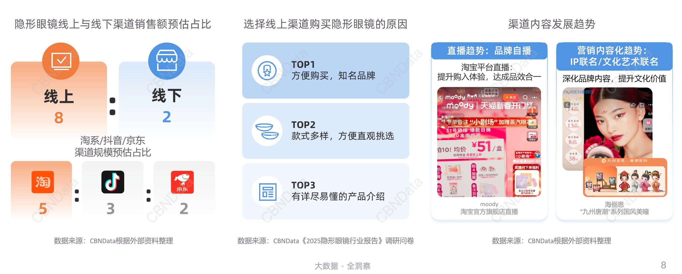 下游渠道变革最为显著。线上平台占据约八成的市场规模,成为隐形眼镜销售主阵地。其中淘宝天猫、抖音与京东形成分化格局,淘宝占据五成市场份额,成为隐形眼镜行业线上销售的核心渠道。随着电商渠道的扩容,直播电商与内容营销逐渐演变为品牌角逐的新增长极。