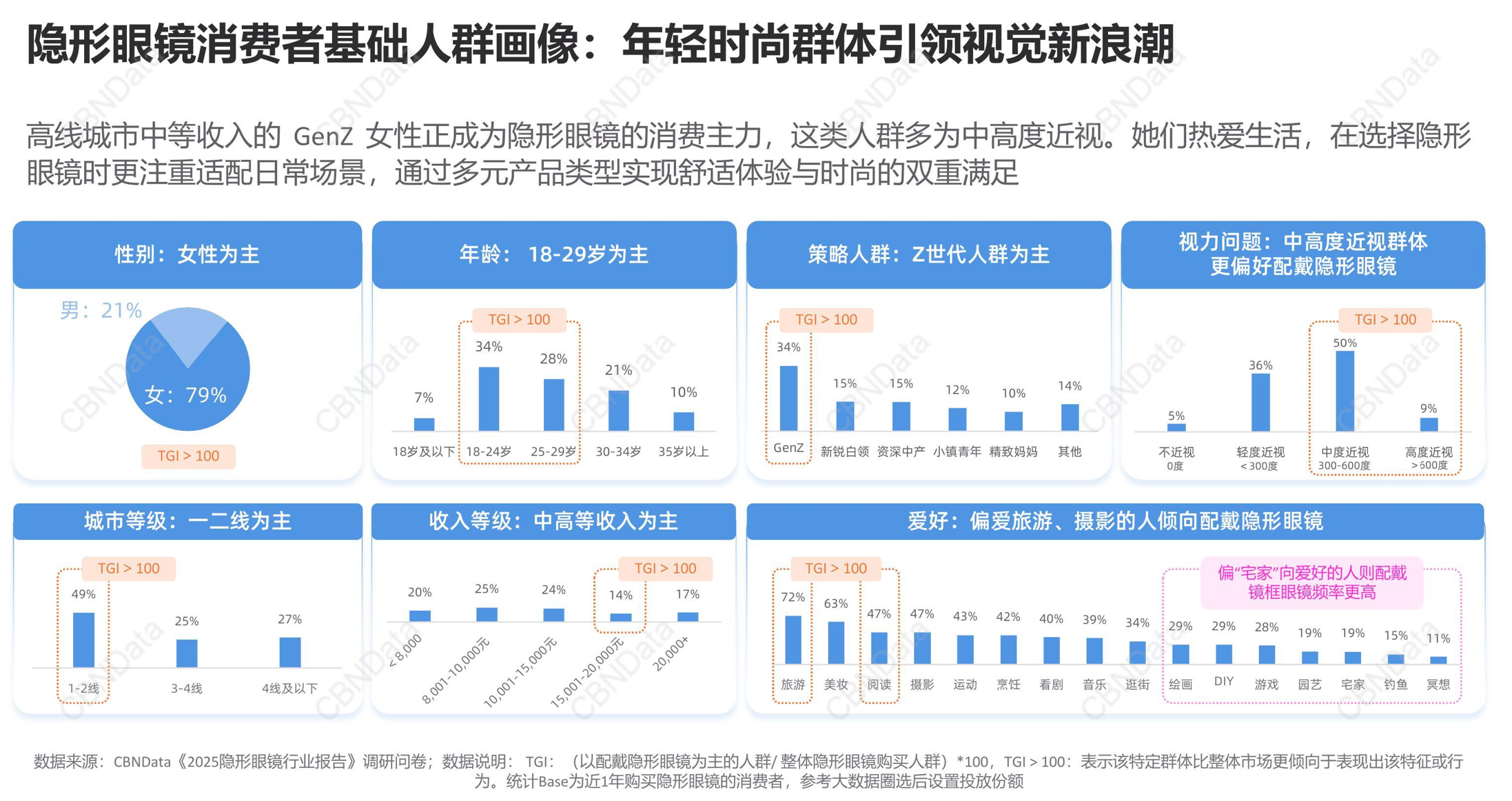 《报告》显示,高线城市中等收入的GEN Z女性正成为隐形眼镜的消费主力,且多为中高度近视,并且热爱户外运动。对他们而言,隐形眼镜能够减少在进行户外活动时的干扰,多元的产品类型也能够实现舒适体验和时尚的双重满足。