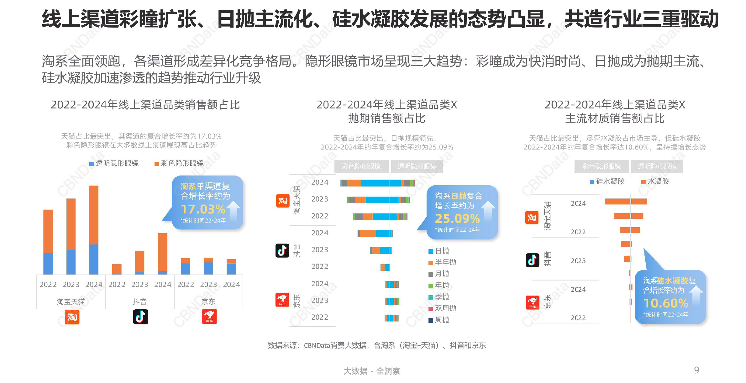 具体而言,淘系在不同品类的隐形眼镜中持续领跑,单渠道复合增长率约为17.03%。其中,彩瞳成为消费热点,日抛逐渐主导抛期选择,硅水凝胶材质产品销售额占比不断提升,彰显发展潜力,在隐形眼镜行业趋势演变中发挥着重要引领作用。