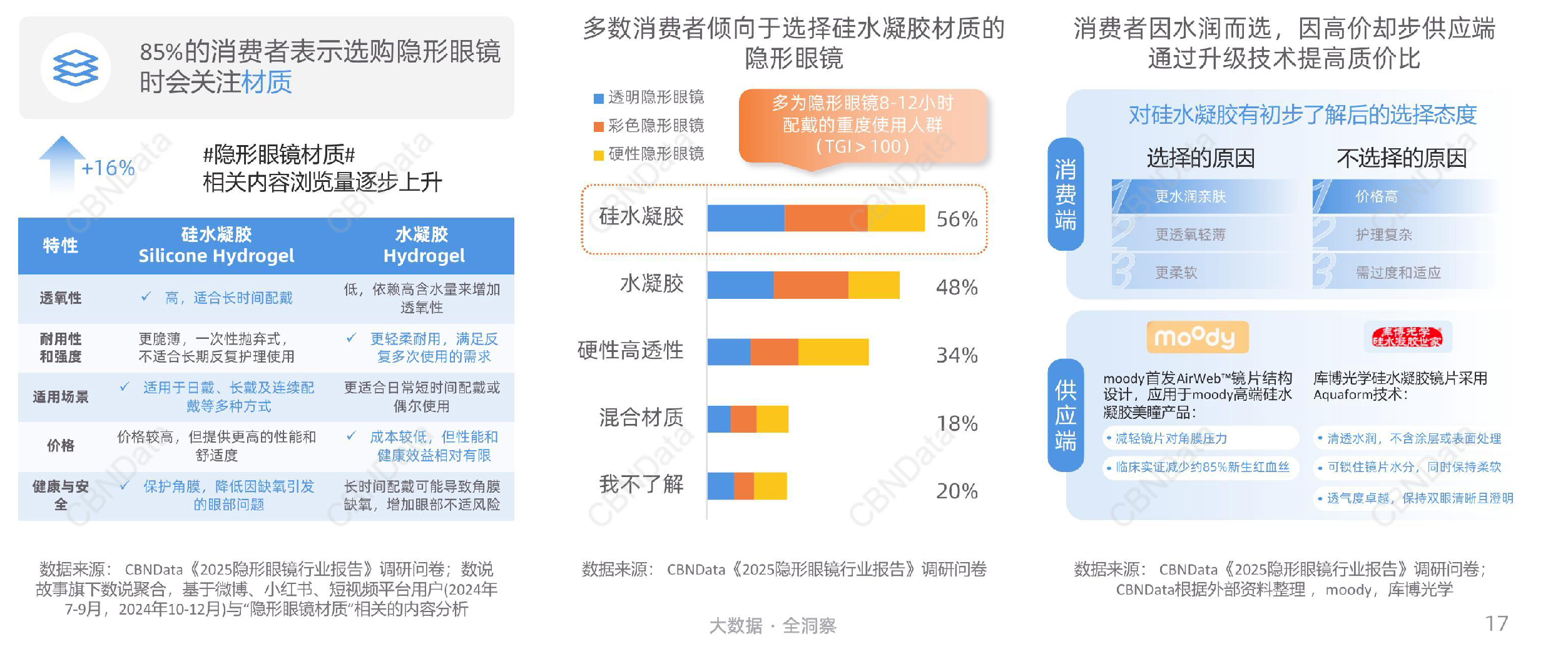 此外,消费者开始日益重视隐形眼镜的材料。《报告》调研结果及数说故事旗下数说聚合数据显示,多数消费者倾向于选择硅水凝胶材质的隐形眼镜,这一材质具备高透氧性与耐用性,但也有消费者因价格高放弃购买,这也意味着供应端通过原料技术研发提升质价比更为重要。捕捉到消费者需求,彩瞳品牌moody表示,其首发的AirWeb™硅水凝胶镜片结构设计,能减轻镜片对角膜的压力,从而减少戴镜引起的新生红血丝;白片领域的库博光学也提出,其硅水凝胶镜片采用Aquaform技术,可以实现在镜片材料中不添加表面保湿涂层或润湿剂的前提下,让镜片从核心到表面都保有充足水分。