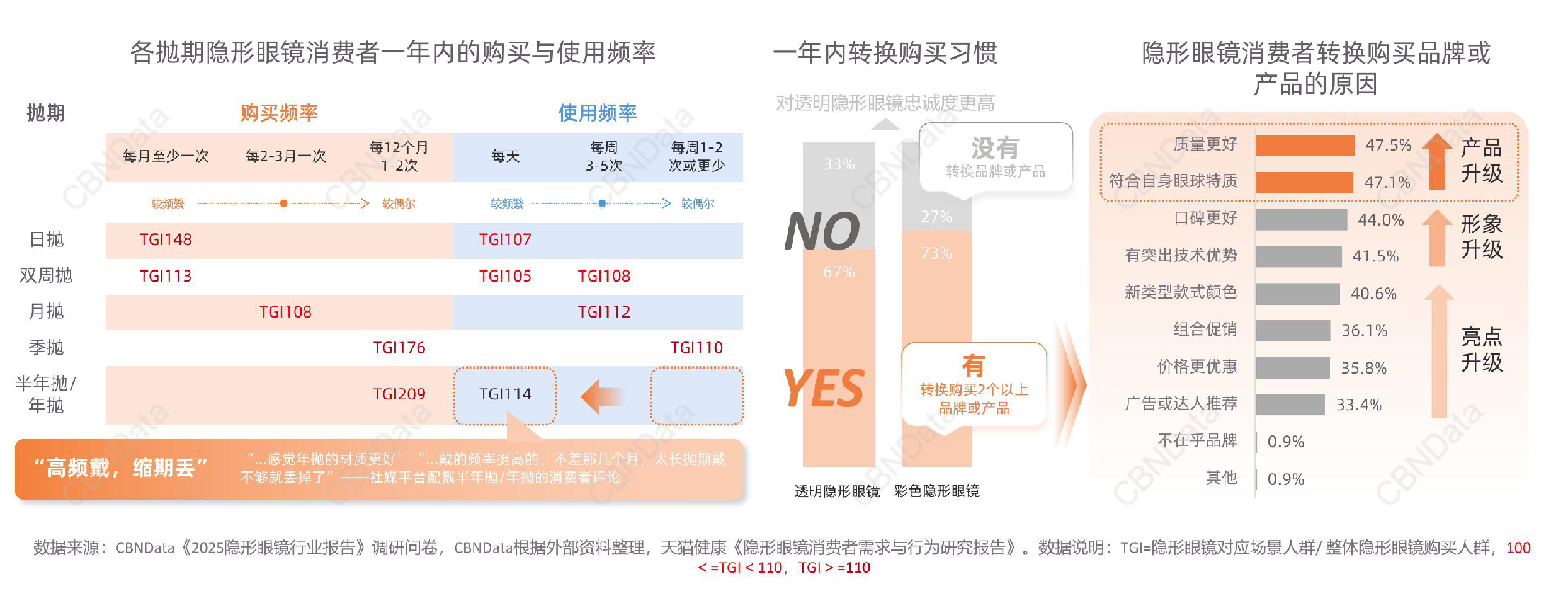 《报告》进一步指出,隐形眼镜购买频率与其使用频率有强相关性,日抛型用户维持每月至少一次的复购节奏,是隐形眼镜的高频消费群体;季抛/半年抛产品则因购买频次与使用活跃度同步走低。但年抛用户群体形成了“高频使用,缩期更换”的行为模式,有超6成的白片使用者以及超7成的彩瞳使用者会在一年内更换产品与品牌。