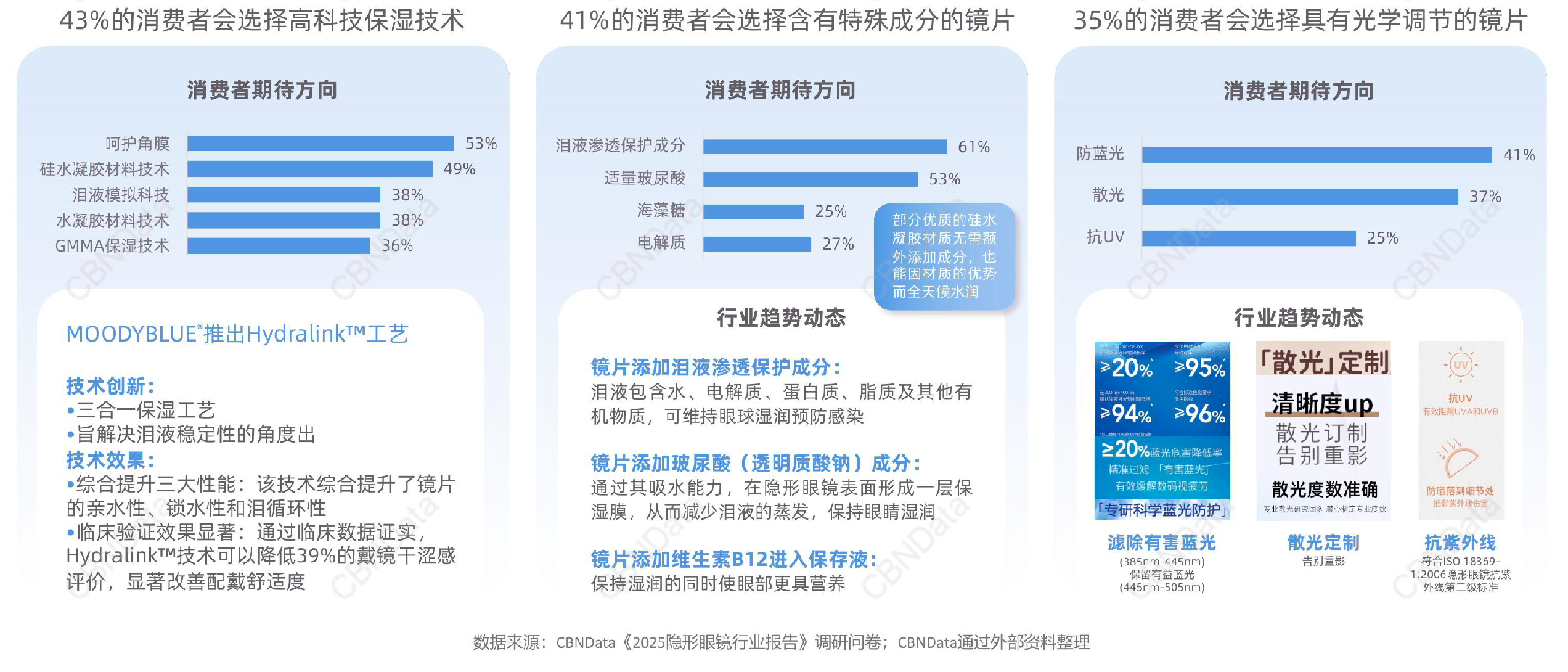 硬性隐形眼镜则持续深耕“精准医疗级”,在提升配戴舒适度以及强护理体验上发力,提升适配相容性、功能性以及简化护理环节是消费者的三大期待。