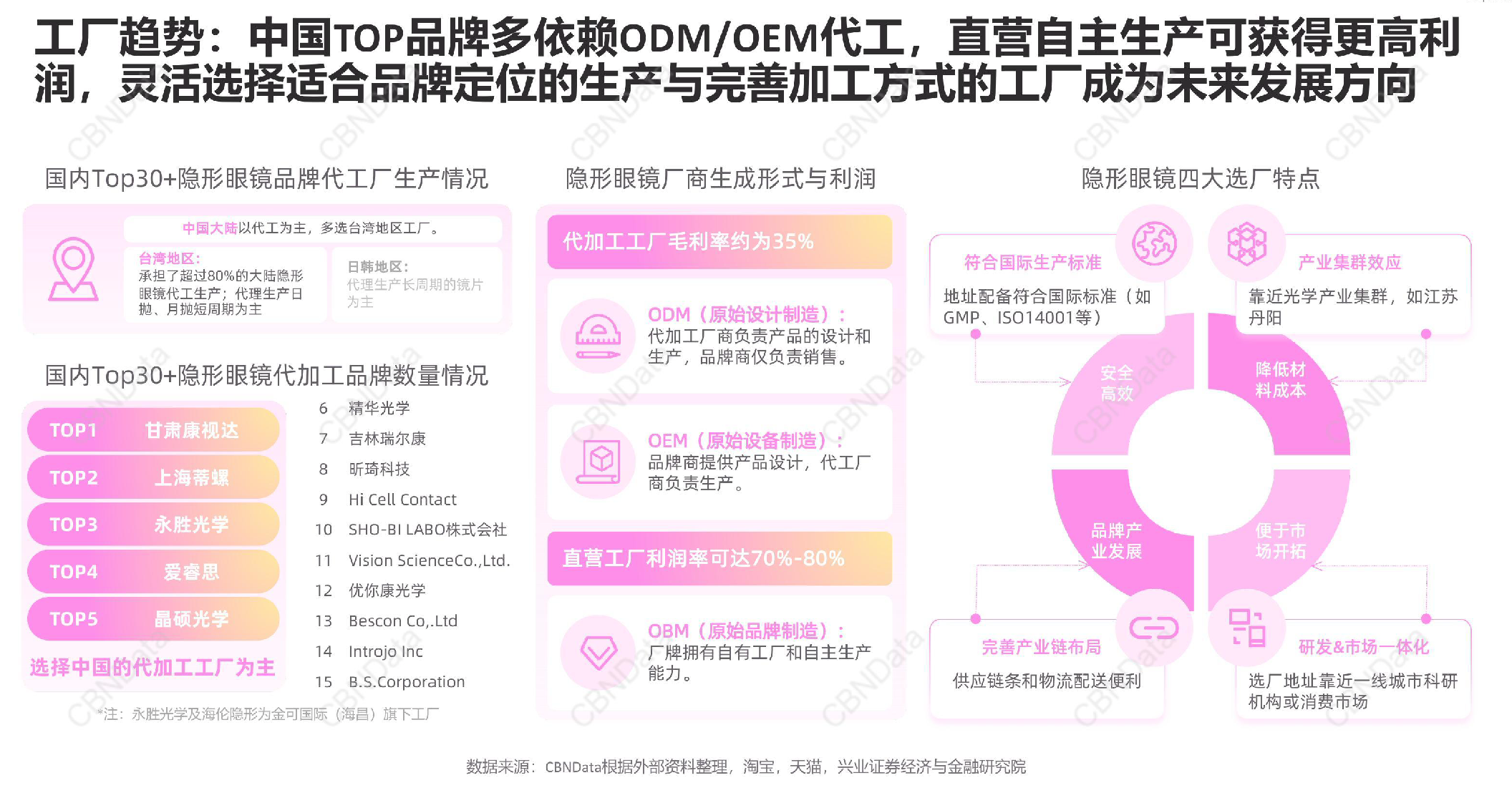 产业上游,多数品牌依赖OEM/ODM 代工,但《报告》显示直营自主生产利润更高,灵活选择适配工厂成为未来方向。一方面,工厂优势关乎品牌竞争力,天猫在渠道侧设置严选标准,筛选品牌工厂证照、产能与专利。品牌还通过国际多地建厂实现能源联产,如库博光学的波多黎各工厂启用了新的发电设施,可将碳排放量减少33%,相当于减少5,000辆汽车上路。彩瞳赛道,头部品牌如moody早在五年前便开始投资建厂,凭自研技术、15项专利/软著壁垒构建竞争优势。