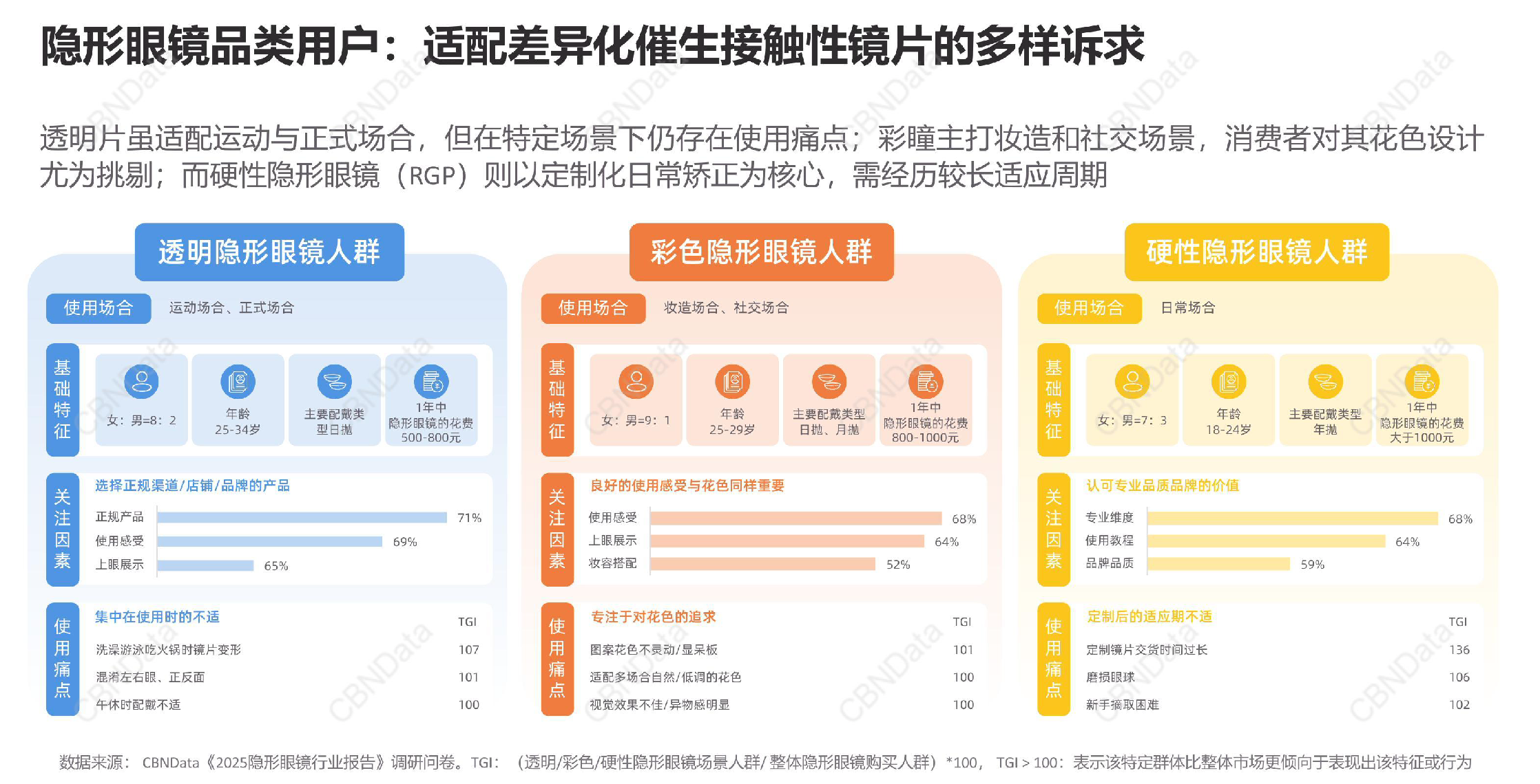 具体到消费者对不同品类的需求,透明片适配运动与正式场合,配戴时常出现不适感成为品类痛点。彩瞳主打妆造与社交场景,消费人群追求花色的时尚感。硬性隐形眼镜以定制化的日常矫正为核心,定制后有较漫长的适应周期。