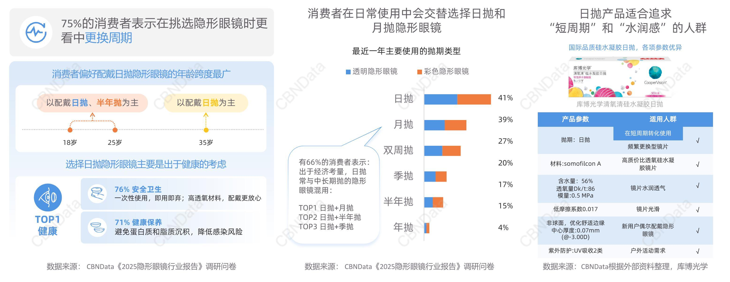 抛期也是消费者重点考量的因素之一。多数消费者认可日抛的“健康”特性,18岁到25岁的年轻人以日抛、半年抛为主,35岁以上的消费者以日抛为主。但仍有66%的消费者出于经济考量,会选择混合使用,比如“日抛+月抛”的“搭子”组合是消费者的性价比首选。