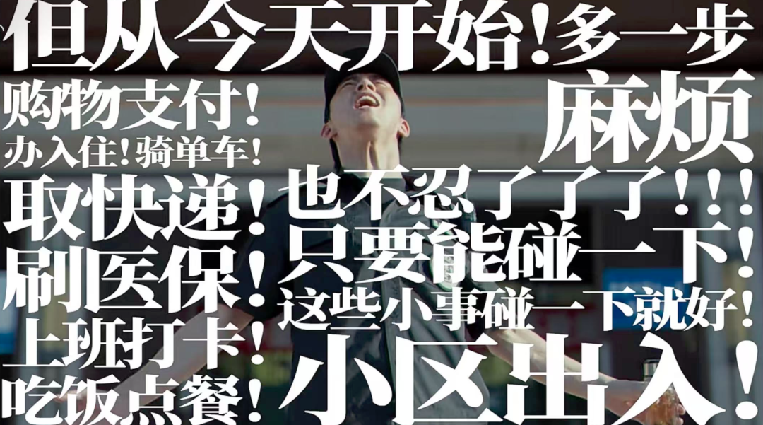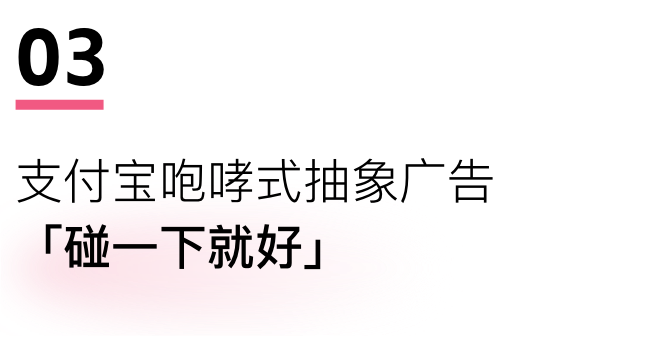 4月24日,支付宝为“碰一下支付”发布抽象宣传片。片中选取五个生活场景,主角像讲脱口秀一样调侃疲惫打工人的“心酸”:生活、工作本来就很辛苦了,还要扫码,打开闪光灯扫码,点关注,加客服,注册会员,领券…… 多一步也忍不了啦,从今天开始,就现在,忍一时,不如用手机碰一下就完事。