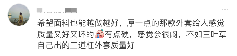 有人吐槽外套面料还不如三叶草自己出的,希望能更透气一些。