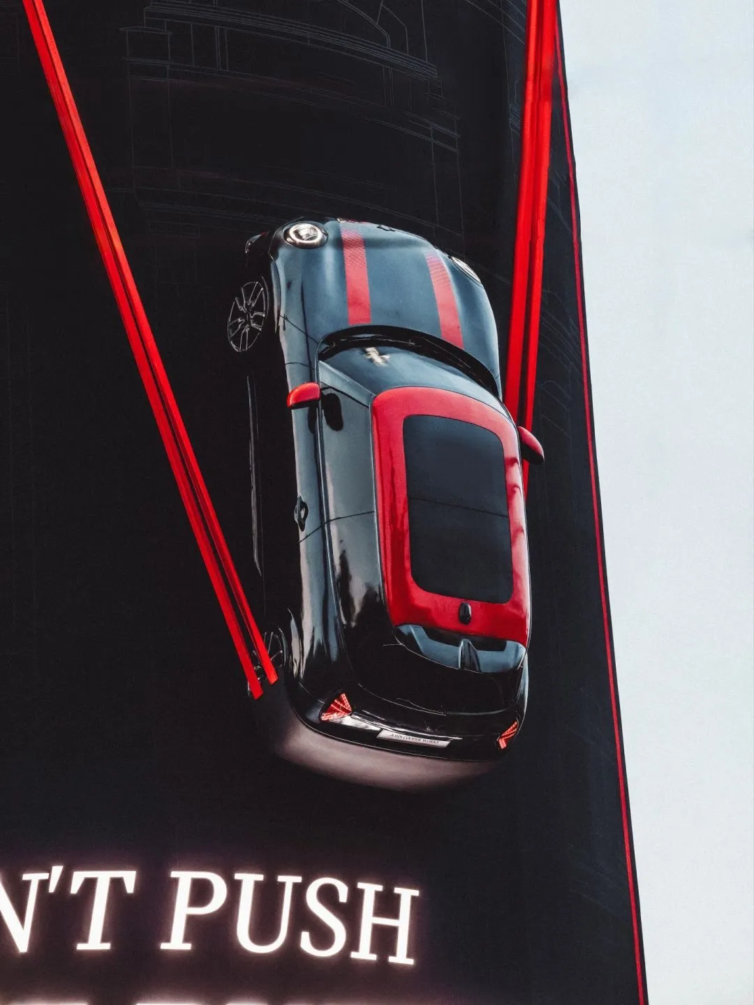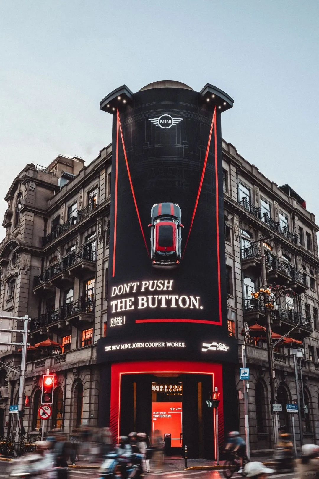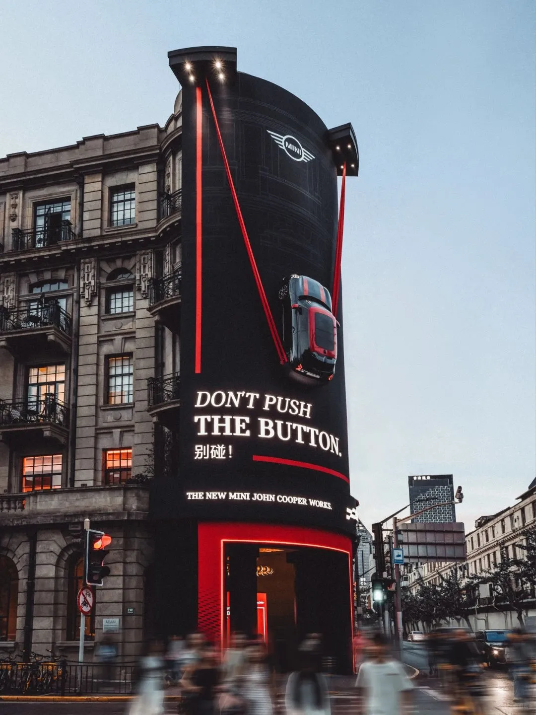 这是MINI新推出的电车MINI JCW,车子被悬空在上海外滩百年沙美大楼上,反重力立体广告牌真是又酷又帅的~