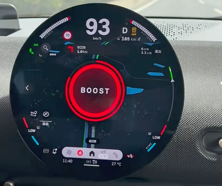 其实这个boost按钮,代表的是MINI JCW的“boost功能”,按下方向盘上的boost键,屏幕上同步显示,车子会爆发出额外的动力。