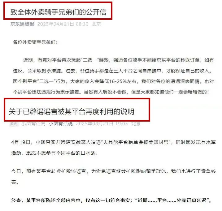 随后京东和美团掀起关于骑手的舆论战。4月21日,京东发布“致全体外卖骑手兄弟们的公开信”指控美团强迫骑手“二选一”,并发布紧急援助措施,包括为骑手的对象优先安排工作等。同日部分网友晒出刘强东亲自送外卖的照片。4月22日刘强东邀请了40多名外卖员一起吃火锅,“刘强东送外卖后请骑手吃饭”等相关动态登上多平台热搜,掀起京东与美团之间“外卖大战”的话题热度。