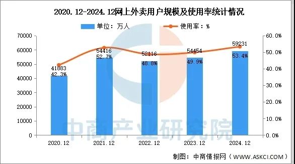 截至2024年12月,我国网上外卖用户规模达5.92亿人,较2023年12月增长4777万人,占网民整体的53.4%。据艾媒咨询预测,预计到2027年我国在线餐饮外卖行业市场规模将达到1.96万亿元。另外商务部国际贸易经济合作研究院发布的报告预测,2030年我国即时零售市场规模将超2万亿元。