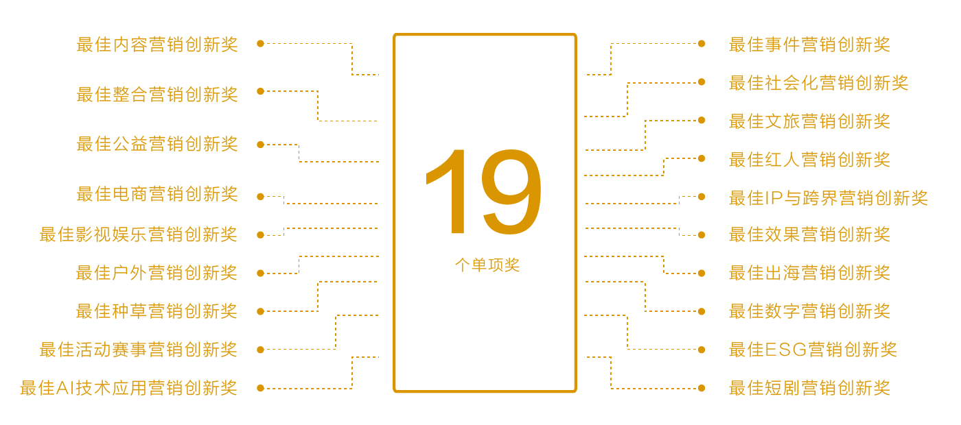 单项奖:基于参赛作品的营销策略及内容划分,本届共设19个单项奖。其中,最佳种草营销创新奖、最佳文旅营销创新奖、最佳短剧营销创新奖、最佳AI技术应用营销创新奖为本届新增赛道。