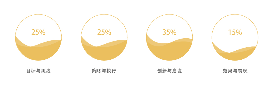 单项奖及行业奖:采用组委会初审和专家评委终审两种方式进行综合考量。主办方初审主要对作品的基本信息、格式、完整性、真实性等进行审核,专家终审则是由近百位营销业领袖及行业资深人士组成的评审团,按以下四个维度标准打分:目标与挑战25%、策略与执行25%、创新与启发35%、效果与表现15%。根据初审及终审结果,来确定每个单项中的金、银、铜奖(可能有空缺)。金、银、铜奖的数量将不超过参赛作品总数的5%、8%、12%。