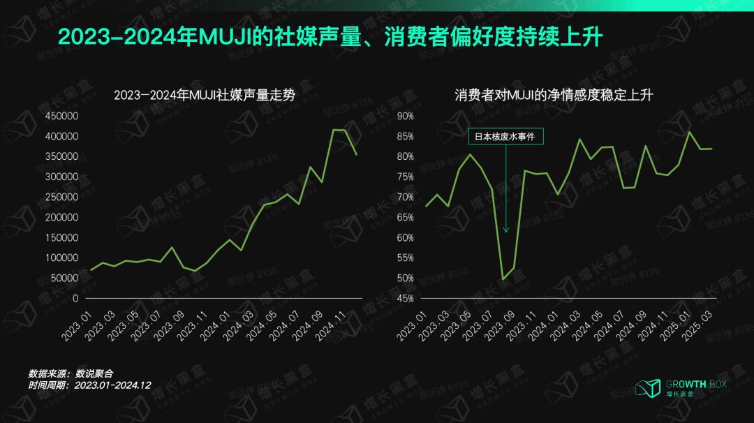 中国消费者开始重新看到、喜欢并选择MUJI。根据数说聚合,2023-2024年MUJI在小红书、抖音等社媒平台上声量稳定攀升,消费者对MUJI的净情感度也持续上升。