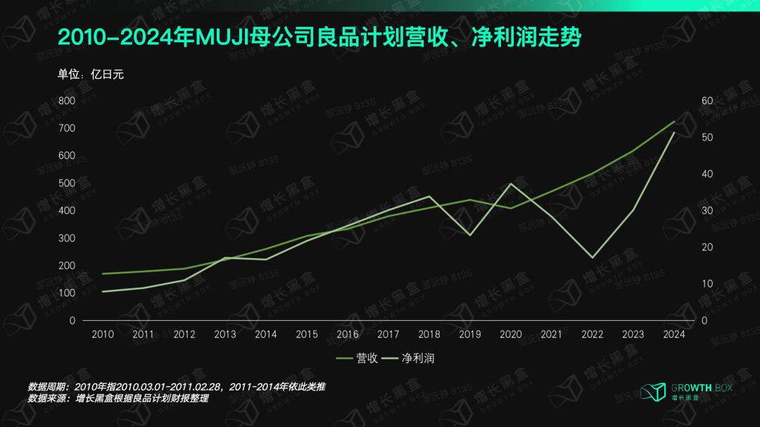 2024年3月至2025年2月,良品计划营收同比增长17%至7238亿日元(约合370亿元人民币),净利润同比大涨70%至512亿日元(约合26亿元人民币),创历史新高。