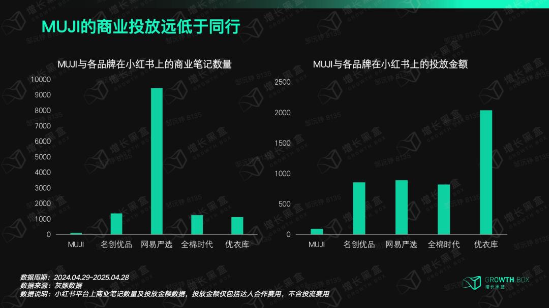 从数据来看,MUJI在线上营销投放力度十分有限,其在小红书上投放的商业笔记数量和投放金额都远低于网易严选、名创优品、优衣库、全棉时代等品牌。