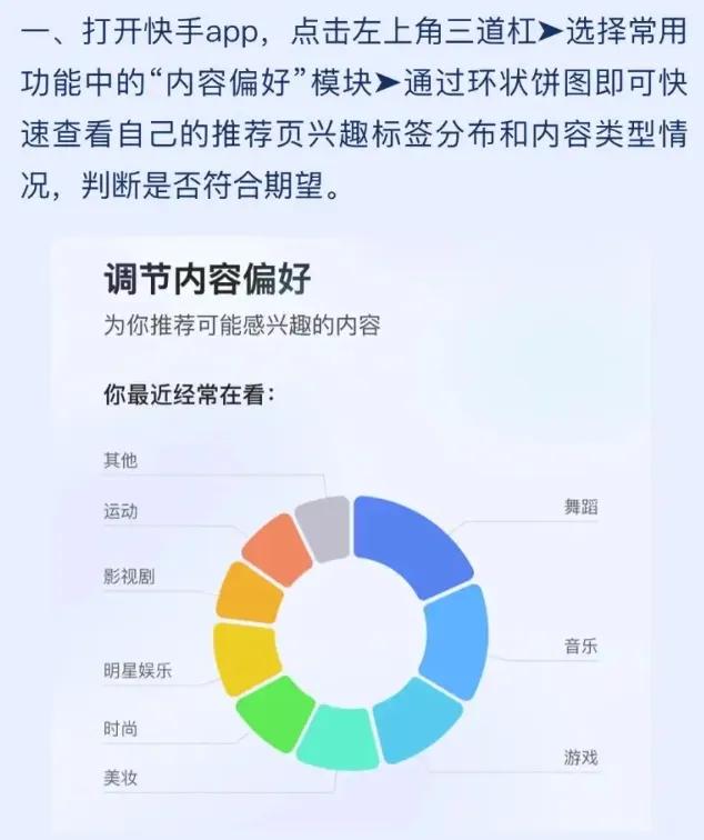 在操作流程上,用户目前打开快手APP后点击左上角菜单栏,便可在常用功能入口下的“内容偏好”模块就可以用饼状图查阅自己的兴趣标签、推荐内容类型。
