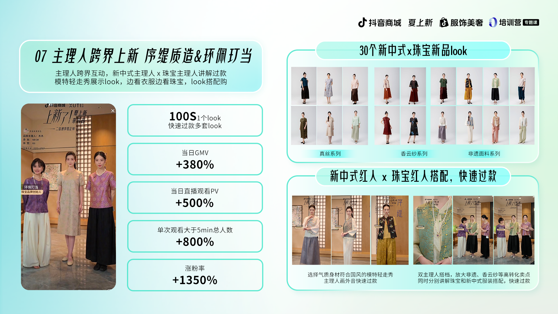 序缇质造&环佩玎当主理人破次元跨界互动,将新中式服饰与珠宝配饰搭配成30套上新look,双方主理人联袂出场讲品,用户在直播间边看衣服边看珠宝,实现look搭配购。相比基准期,当日直播PV增长超5倍,店铺GMV增长超3.8倍,单次观看时长超过5分钟的人数增长超过800%。