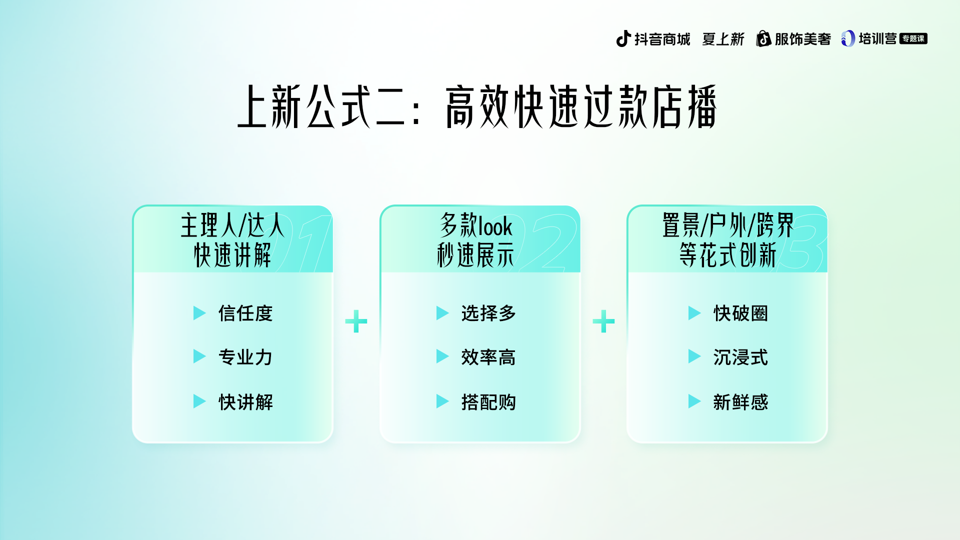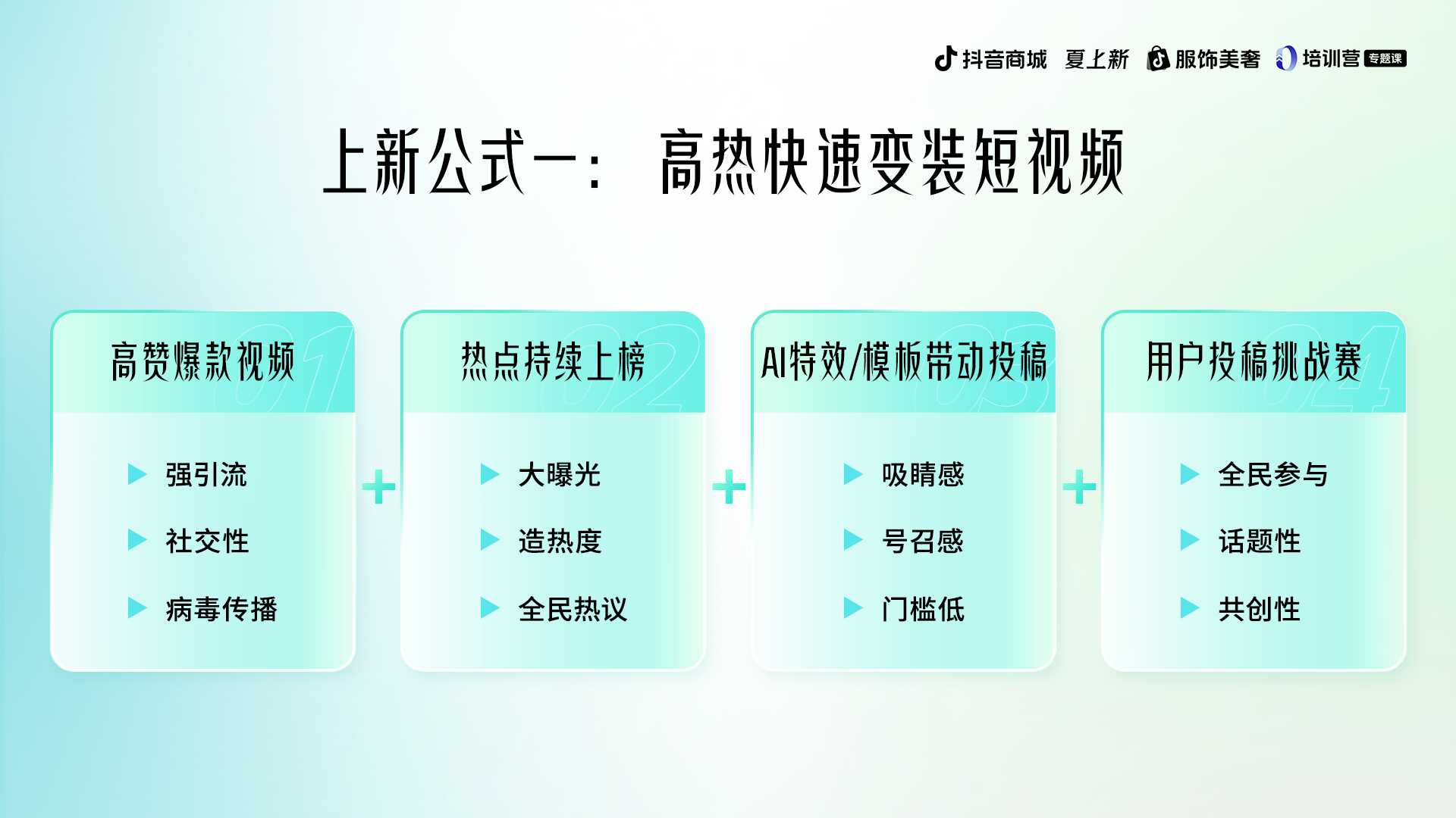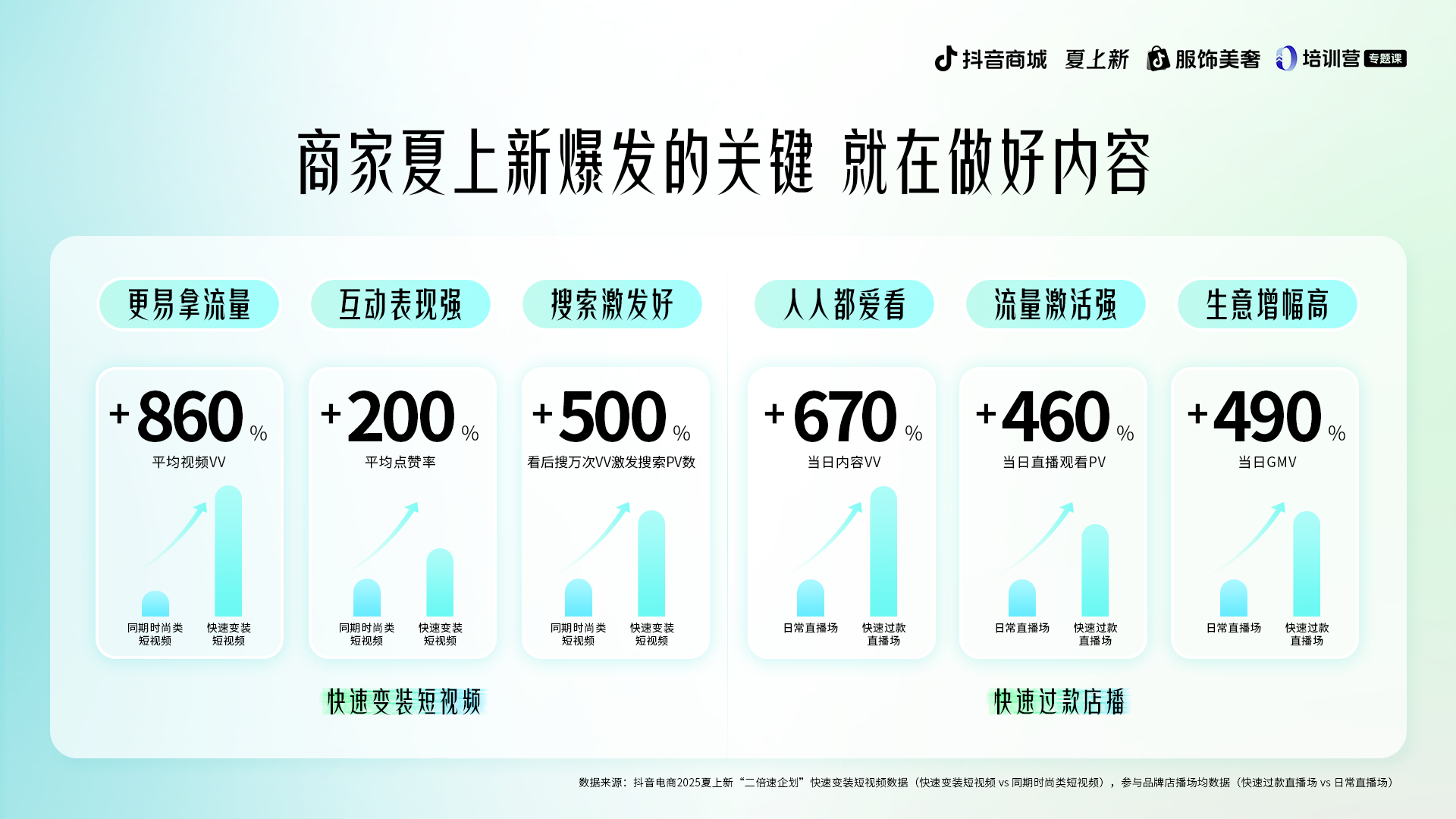 本文将从市场趋势、内容策略、行动指南和成功案例多个维度,重点介绍抖音商城夏上新“快速变装”短视频和“快速过款”直播模式,这是一种经过验证的有效上新方式。通过优化短视频和直播的内容和节奏,帮助商家实现: