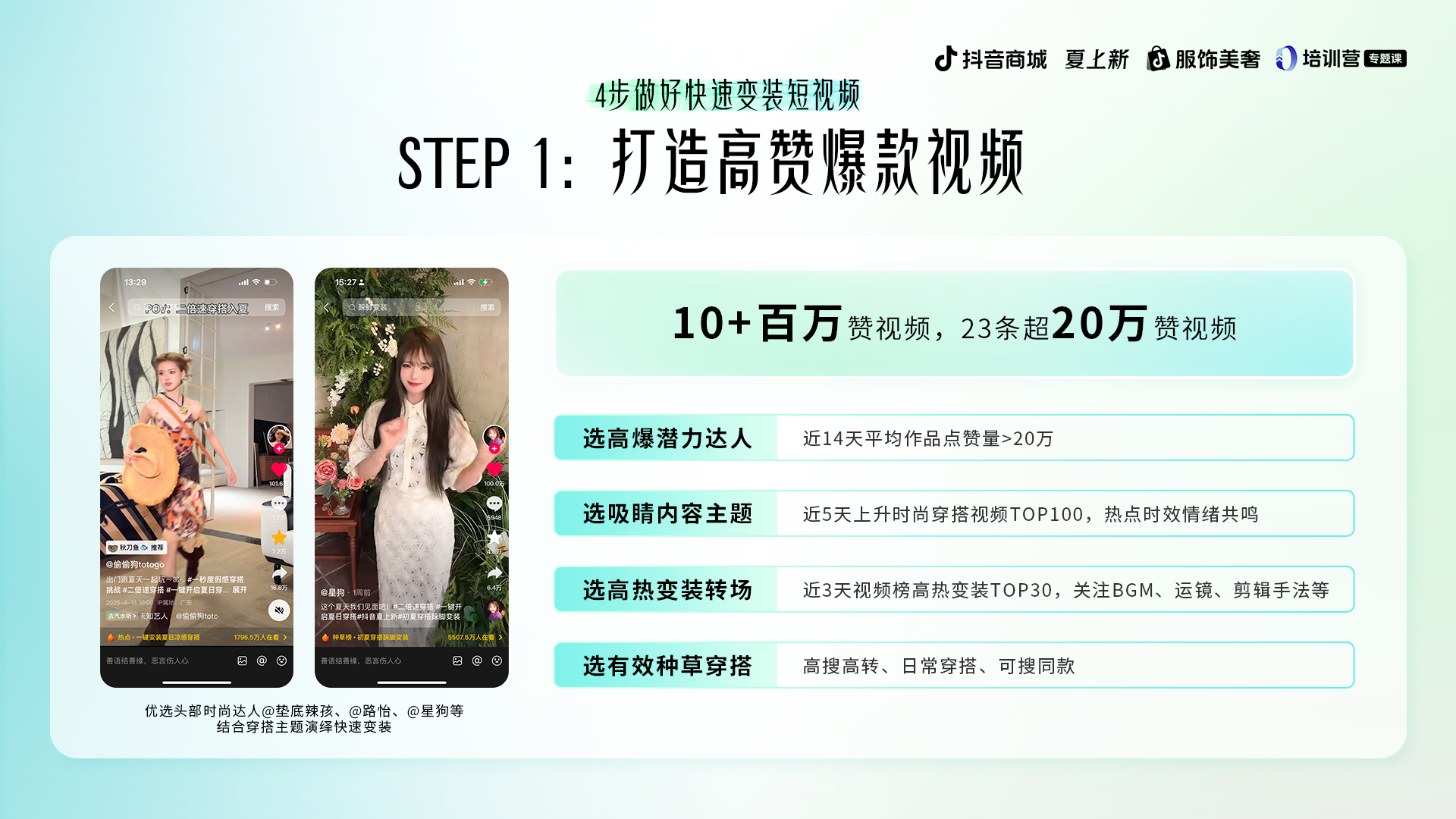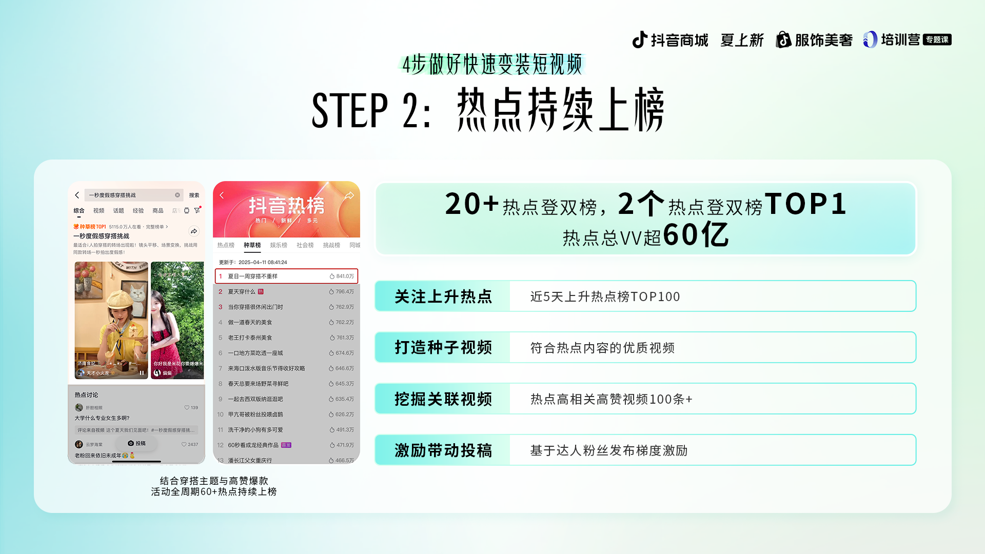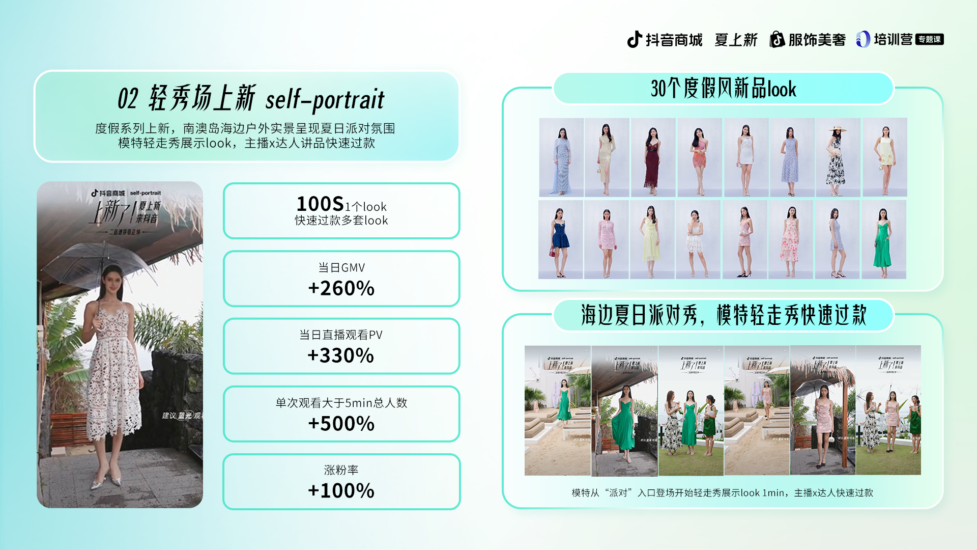 本文将从市场趋势、内容策略、行动指南和成功案例多个维度,重点介绍抖音商城夏上新“快速变装”短视频和“快速过款”直播模式,这是一种经过验证的有效上新方式。通过优化短视频和直播的内容和节奏,帮助商家实现: