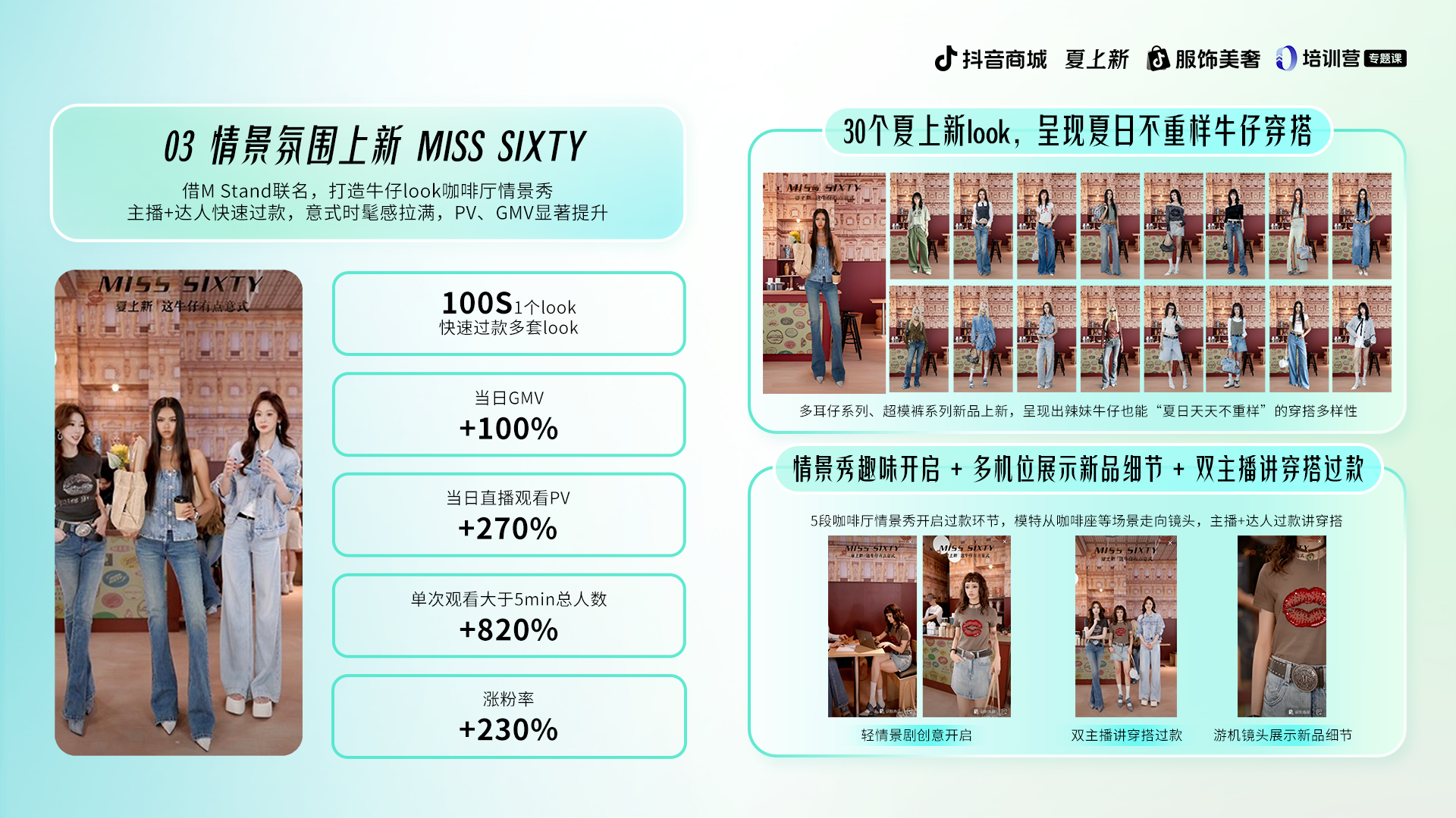 MISS SIXTY借M Stand联名系列新品上新,品牌在直播间打造牛仔look咖啡厅情景秀。模特扮演咖啡厅顾客,情景秀开启内容环节 + 多机位展示新品细节 + 双主播讲穿搭过款,短时间内将新品的意式时髦感拉满,呈现出辣妹牛仔也能“夏日天天不重样”的穿搭多样性,激活用户的消费意愿。对比基准期,当日直播观看PV增长近3倍,店铺GMV实现翻倍增长,单次观看时长超过5分钟的人数增长超过800%。