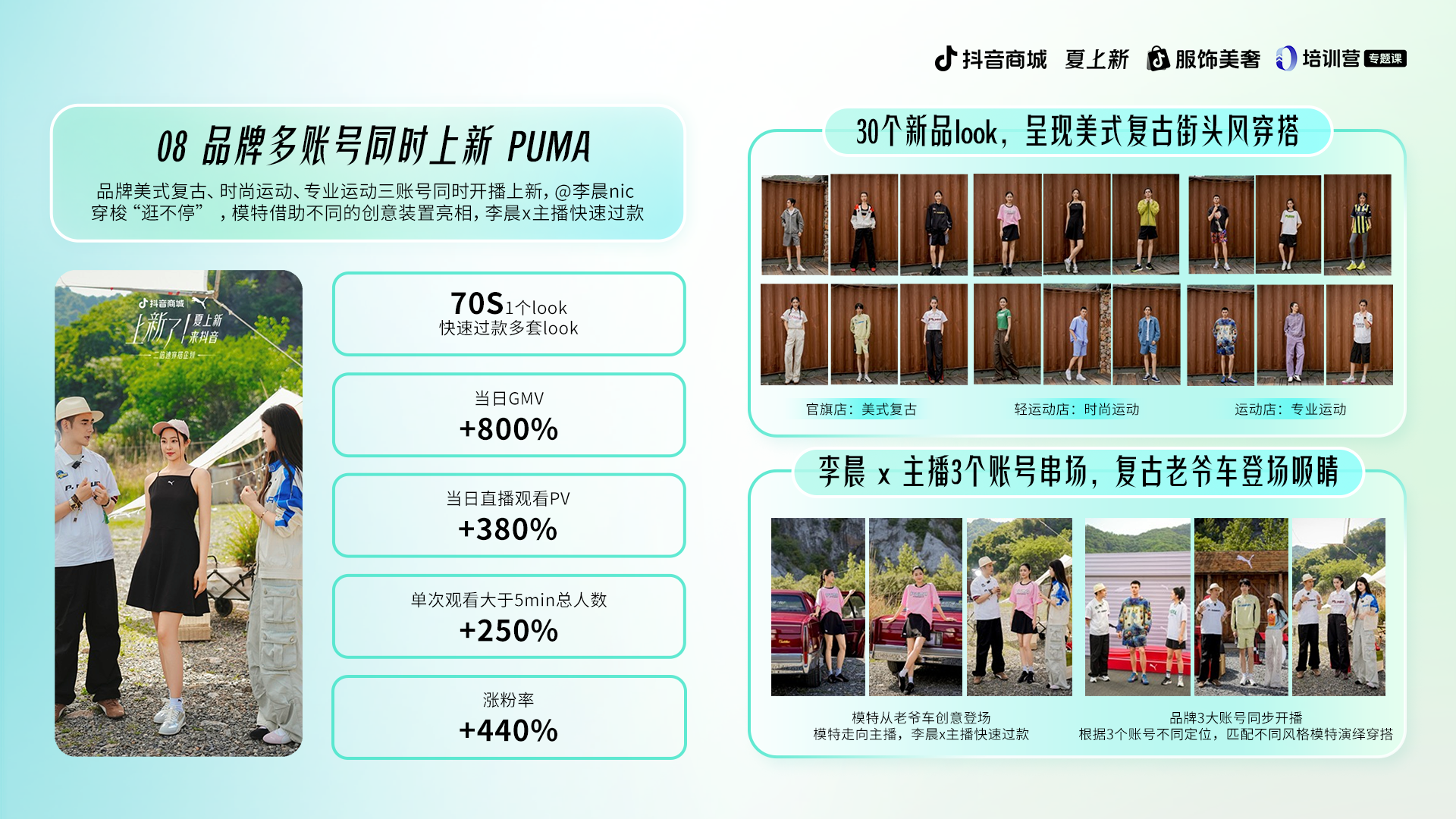PUMA美式复古、时尚运动、专业运动三个账号同步开播上新,30款新品搭配出3种风格,@李晨nic 穿梭在3个直播间“逛不停”,模特借助不同创意装置惊喜亮相,李晨和主播一起快速过款,当日直播PV与GMV均实现数倍增长,单次观看时长超过5分钟的人数增长超过250%。