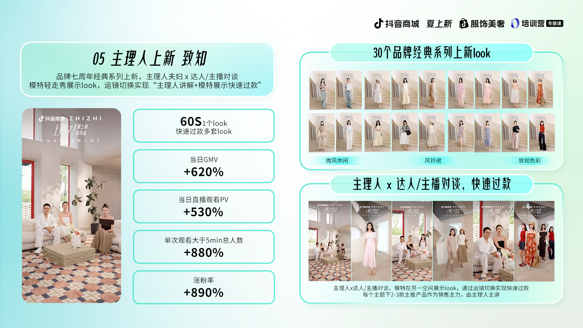 致知七周年上新,品牌主理人夫妇与达人、主播对谈,模特在另一空间展示look,通过高级感运镜切换实现“主理人讲解+模特展示”快速过款,既契合品牌调性风格,又充分展示了新品细节。相比基准期,当日直播PV增长超5倍、店铺GMV增长超6倍,单次观看时长超过5分钟的人数增长超过880%。