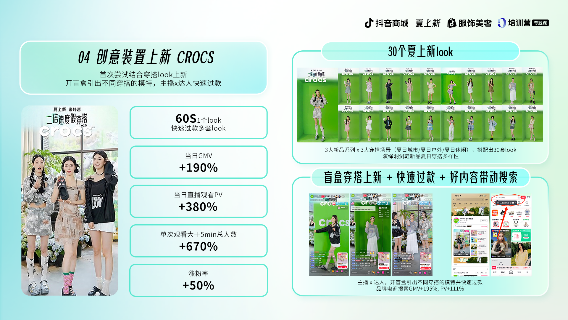 CROCS 首次结合穿搭look上新,在直播间搭建“上新穿搭盲盒”,盲盒开启引出不同穿搭的模特,拉满用户的期待感,同时主播和达人对新品进行讲解,快速过款30个look。3大新品系列结合夏日城市、夏日户外、夏日休闲3大夏日穿搭场景,演绎出洞洞鞋新品穿搭多样性。当日直播观看PV增长近4倍、店播GMV增长均接近2倍,单次观看大于5分总人数超670%。
