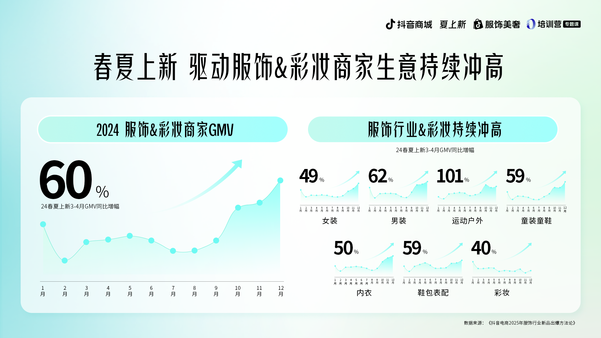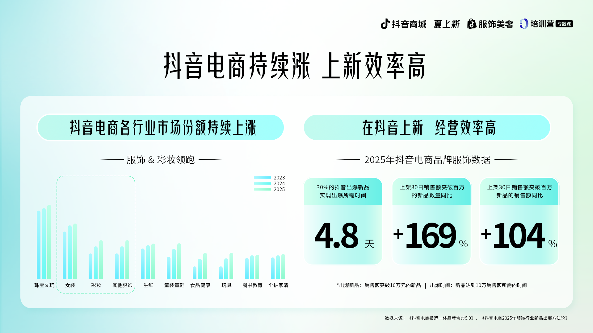 抖音电商持续领跑,春夏上新成为服饰与彩妆新品业绩突破的关键节点。30%的爆款商品仅需4.8天即可实现出爆,百万级销售额新品数量同比激增169%,相关GMV同比增长104%,展现出惊人的市场爆发力。