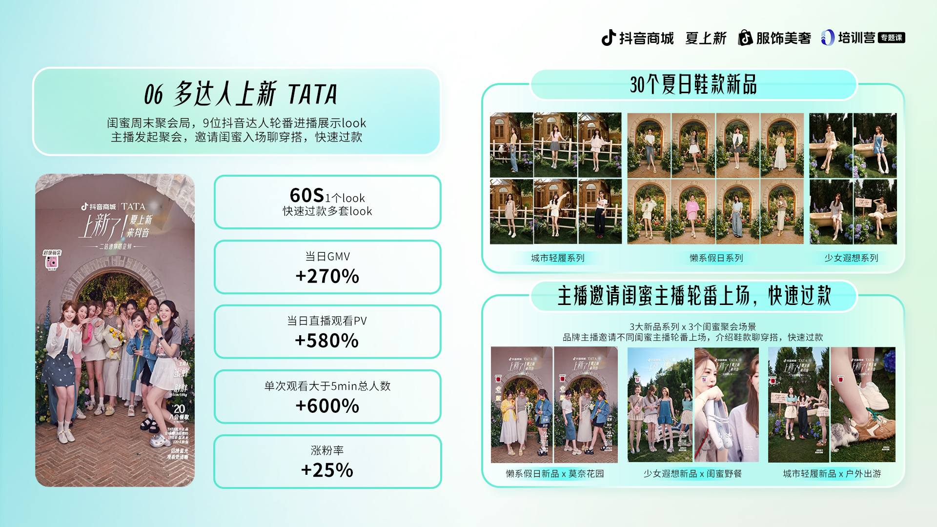 TATA「闺蜜主播团」在直播间组成「闺蜜周末聚会局」,9位达人主播以真实闺蜜身份互动直播,轮番展示超30款夏日新品鞋款。3大新品系列 x 3个闺蜜聚会场景,品牌主播发起聚会,邀请9个闺蜜达人轮流入场聊穿搭聊新品,快速过款。相比基准期,当日直播观看PV增长近6倍、店播GMV增长近3倍,单次观看时长超过5分钟的人数增长超过600%。