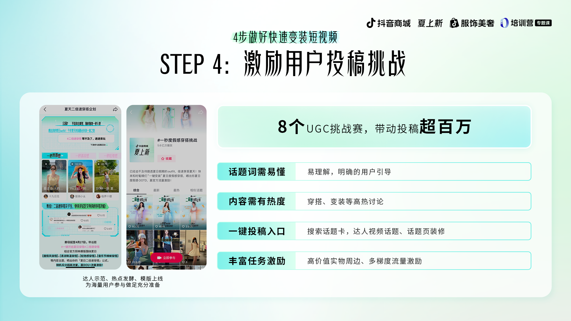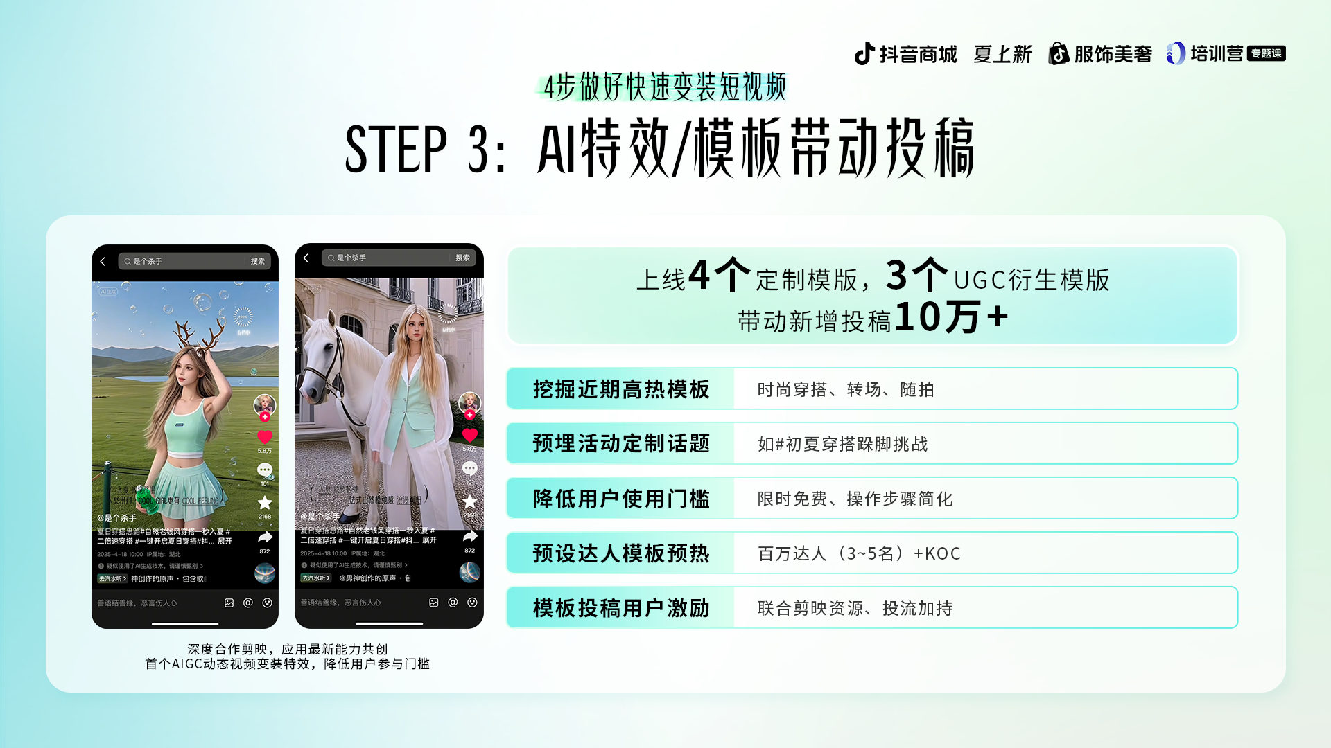 此外,为进一步承接活动热度、降低用户参与门槛,抖音商城合作剪映上线4个定制模板、3个UGC衍生模板,并应用剪映最新能力共创首个AIGC动态视频变装特效,总计带动新增投稿10万+;为激发用户参与投稿的积极性,夏上新活动中发起了8个UGC挑战赛,并同步推出门店导购穿搭挑战,带动投稿量破百万,实现从头部达人到全民创作者的热度外溢。